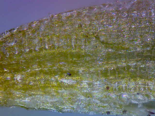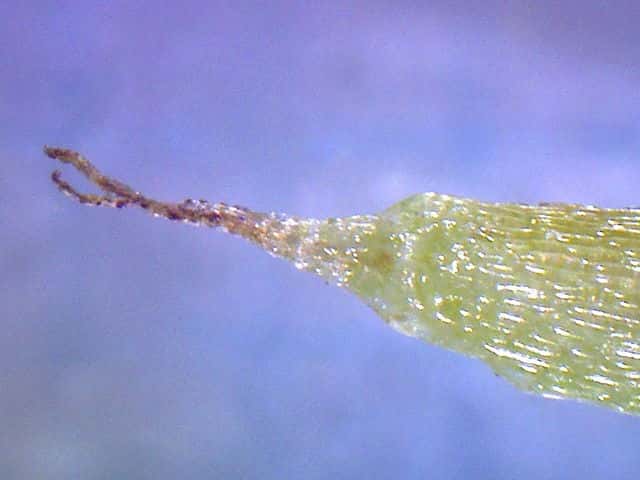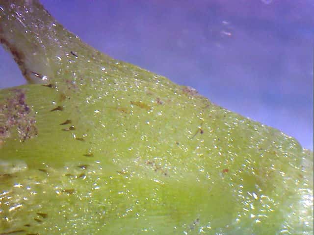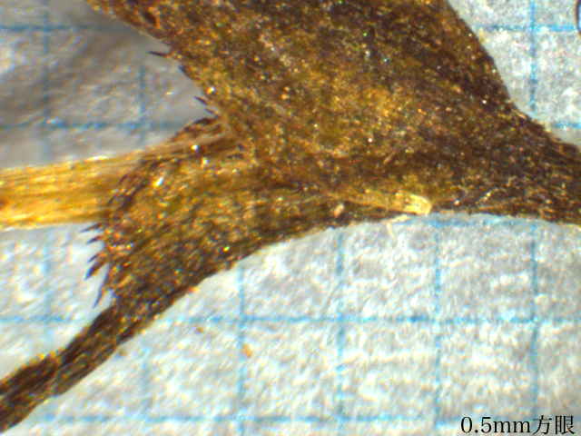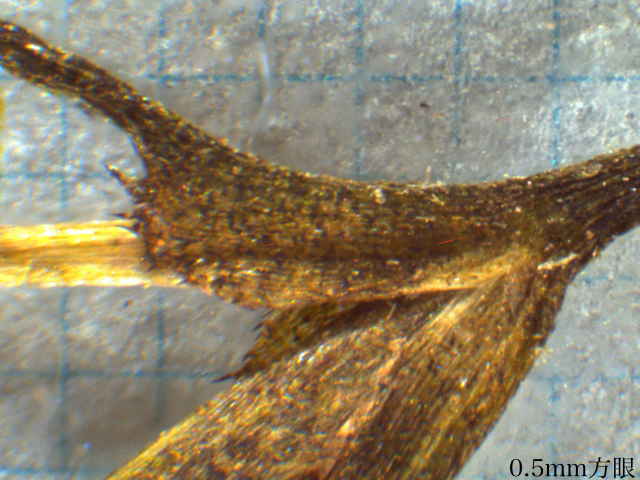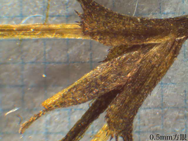 | ▼葉には鋸歯がある。 | ▼葉の幅は0.3〜0.4mm。 | ▼葉の基部は葉鞘となる。長さ約3mm。 |