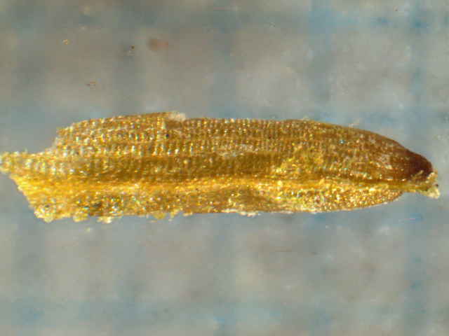 | ▼果実は長さ約3mm、先端に花柱が残る。 | ▼折れた種子、横長の格子紋がある。 | |