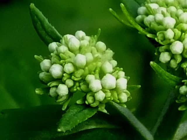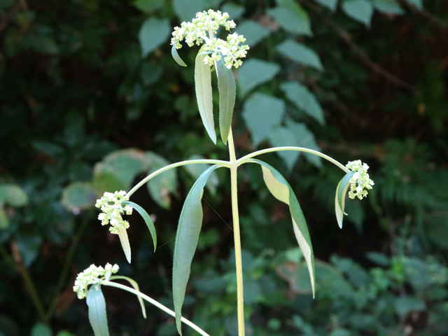| ▼一度切られた茎から出た枝で、時期が遅くなったためか、正常でない花序を出している。 | ▼小苞?が大きな葉状になっている。 | |