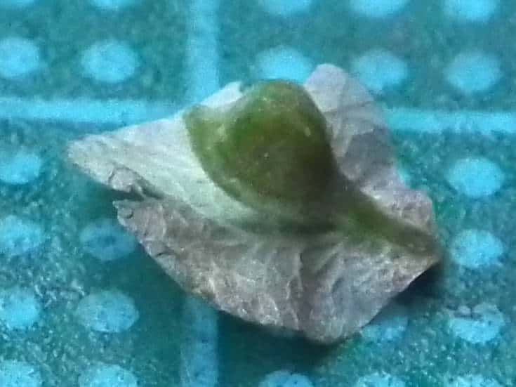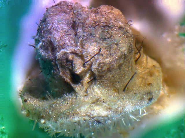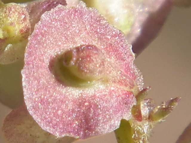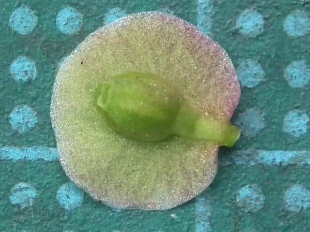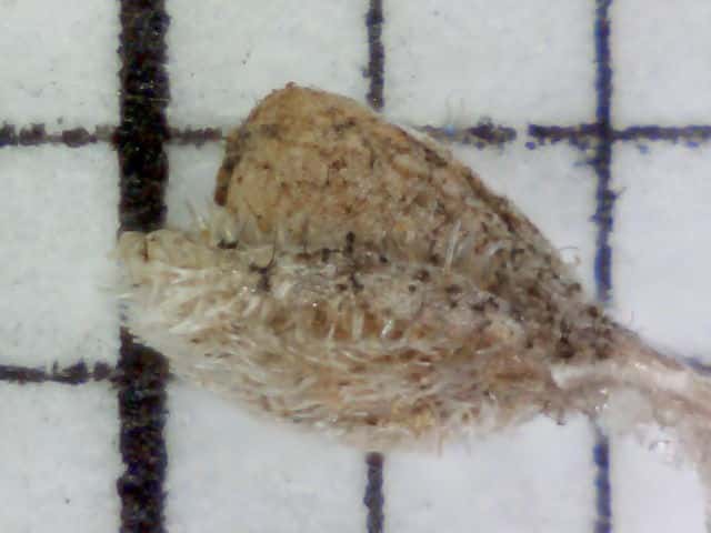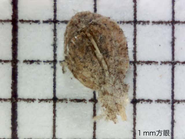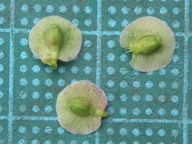 | ▼小苞と果実を分離した。 | ▼果実は長さ約2mm。 | ▼果実の側面。下部に皿状のものがある。 |