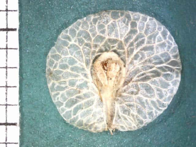 | ▼果実の先端部分、下に皿状部分。 | ▼果実の横断面、子房の1室のみが結実、皿状部分に種子があり、他は膨らんだまま残る。 | |