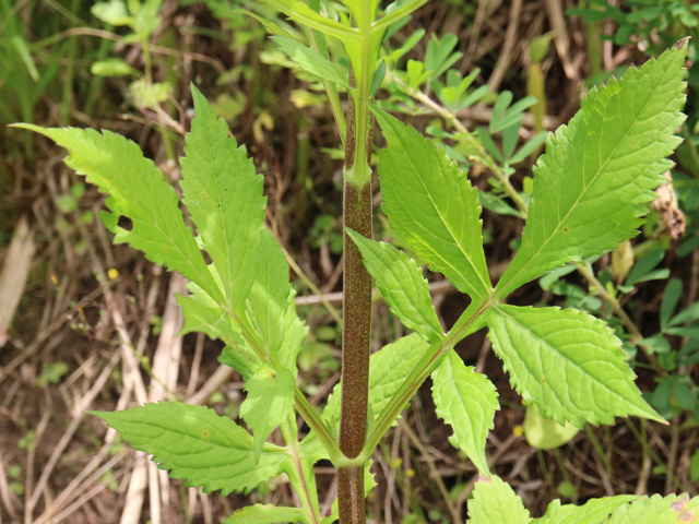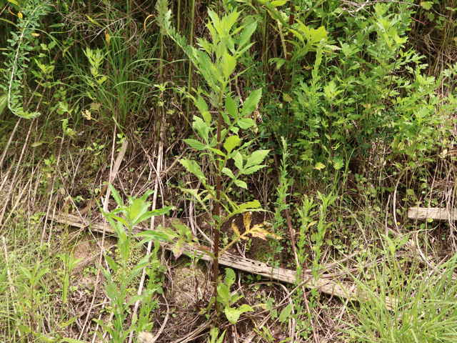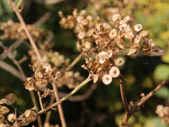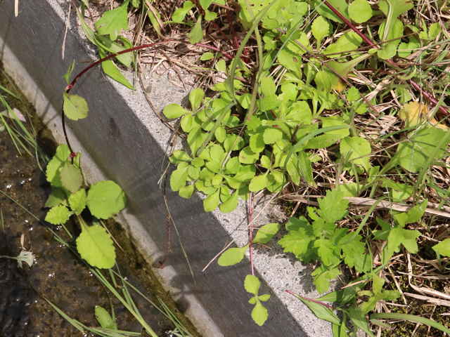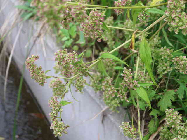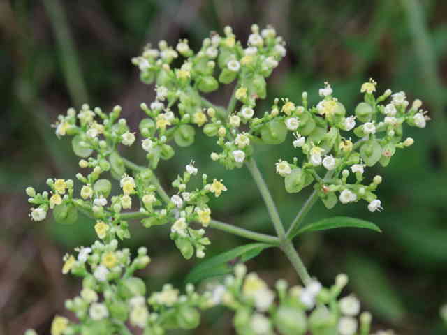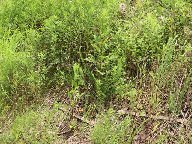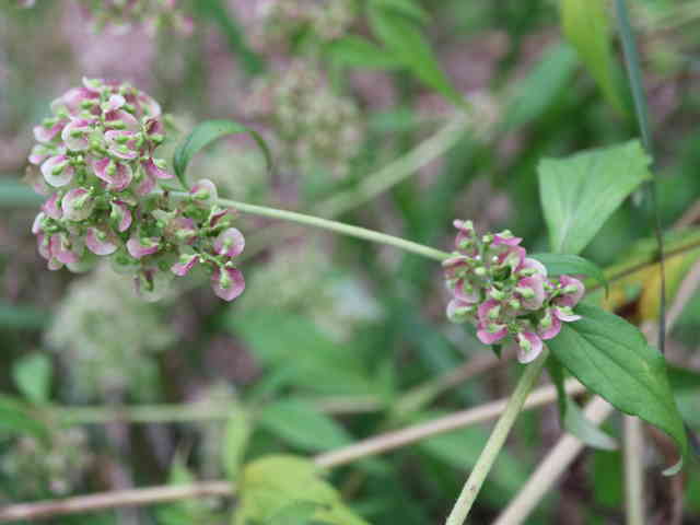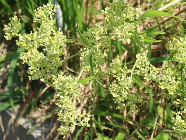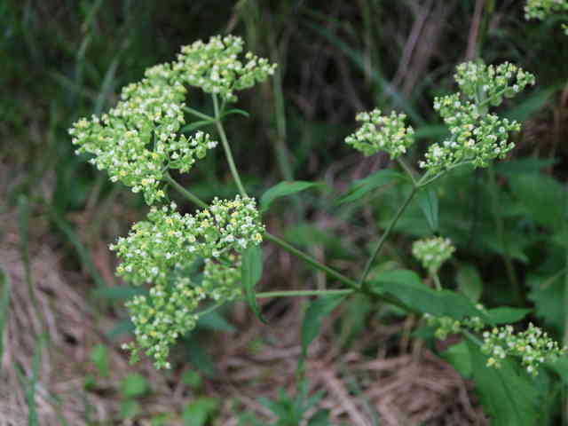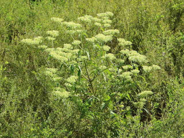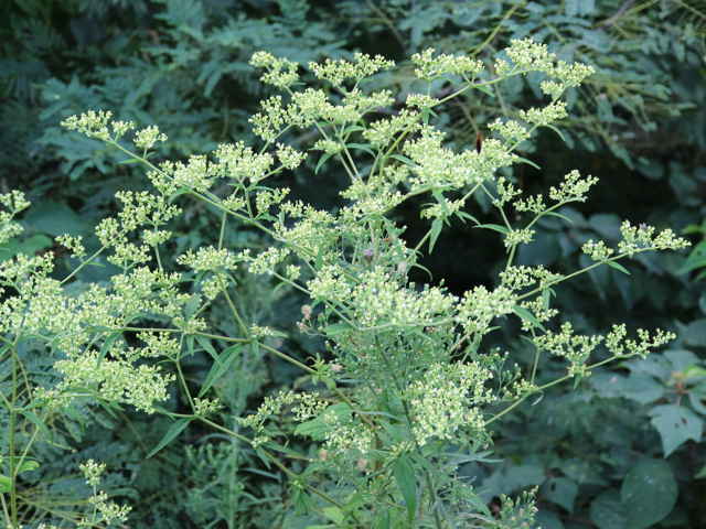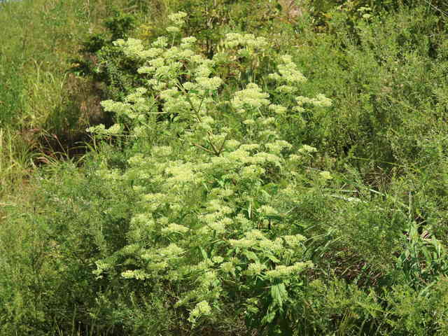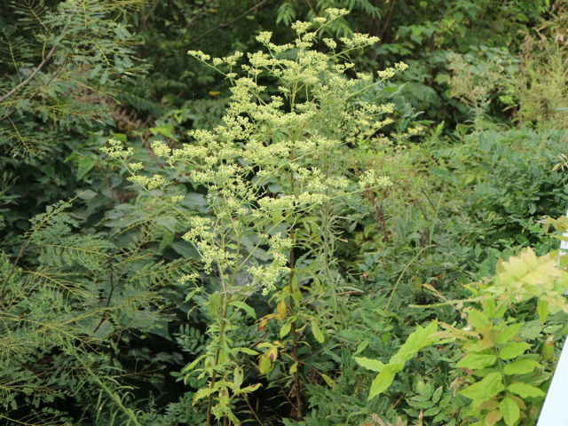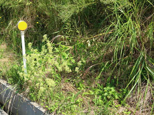 | 新しくできた道路法面とその周辺にだけ多数生えている。小さいものは50cm程度、大きなものは2m近くある。白と黄色の花が混じり、花弁が反り返り、花が小さく見える。オトコエシやオミナエシは雄しべが4本あるが、2本しか確認できない。果実はオトコエシと同様のように思える。(八雲町での観察から) |