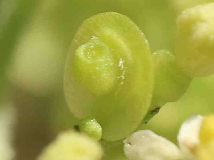 | ▼2017年10月18日 若い果実 八雲 | ▼円く大きくなった小苞に果実が乗る。 | ▼果実の先端に花冠の跡が円く残る。 |