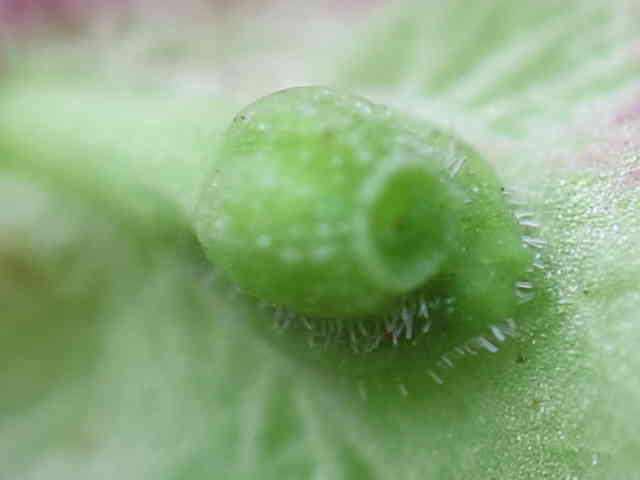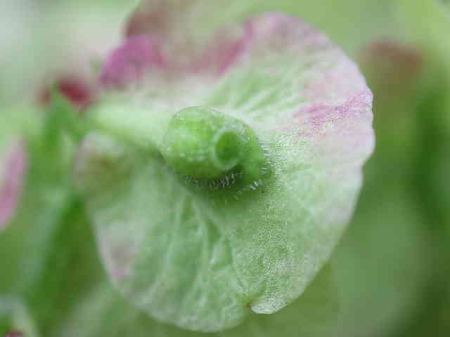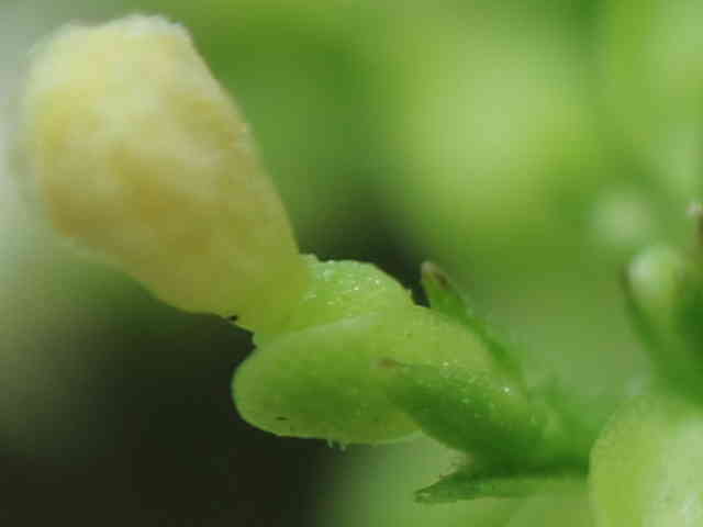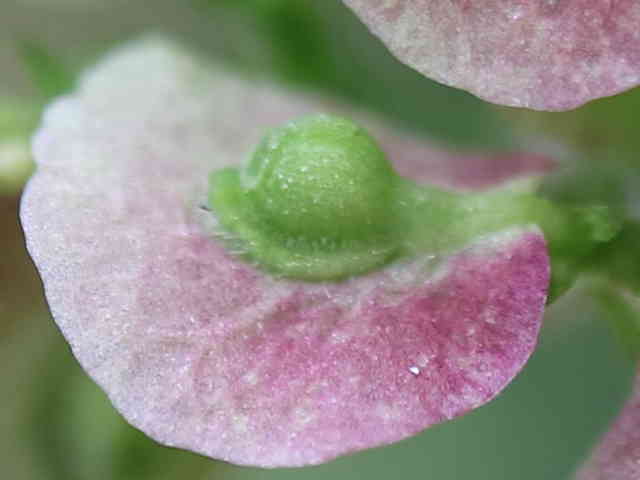 | ▼子房の下部の小苞が大きくなってくる。 | ▼若い果実。下部に円形の小苞がつく。 | |