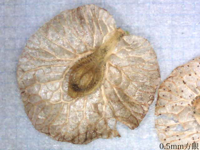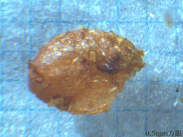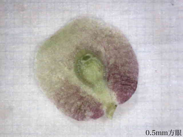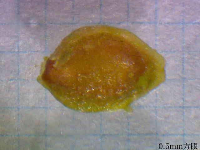 | ▼果実の横断面、上部の2室は空室、下部に種子がある。 | ▼種子は長さ約2mm、一部欠けた。 | |