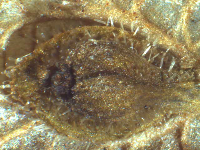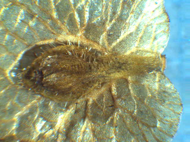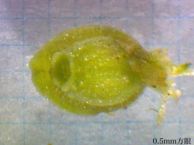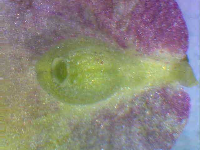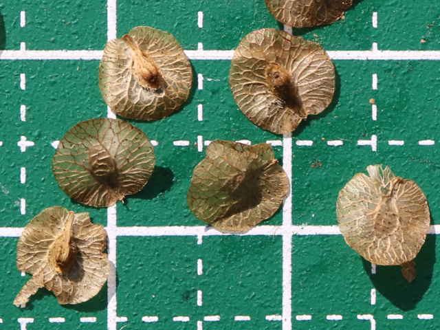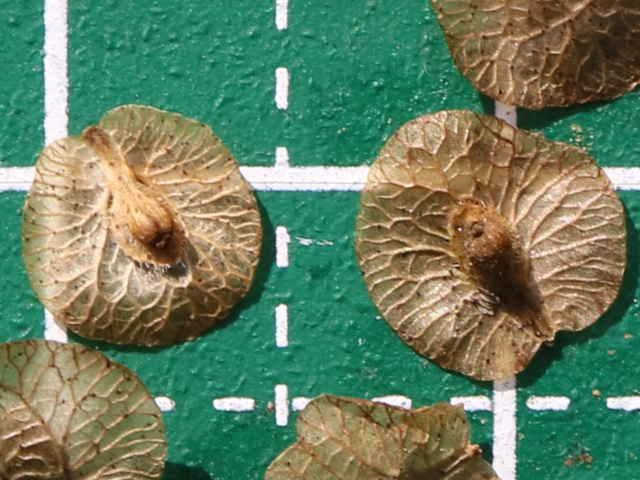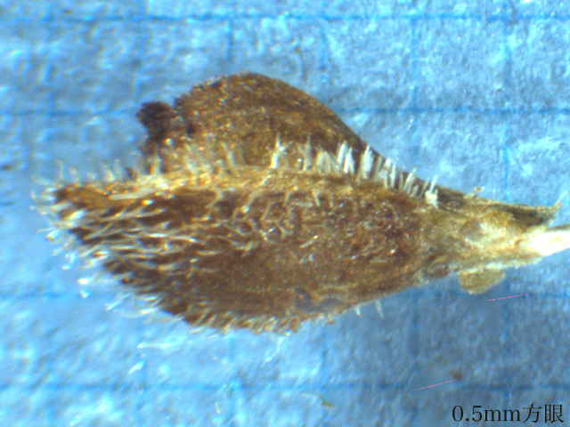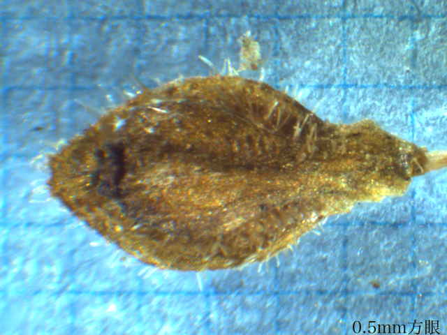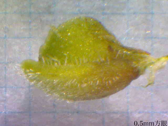 | ▼小苞から外した果実。長さ約2mm。 | ▼果実の側面、上部と下部に膨らみがある。 | |