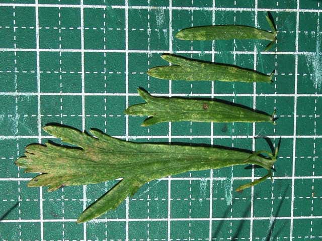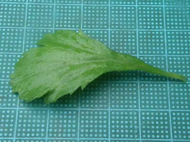 | ▼下部の葉。 | ▼下部の葉、長さ6.5cm〜上部の葉、長さ1.5cm | |