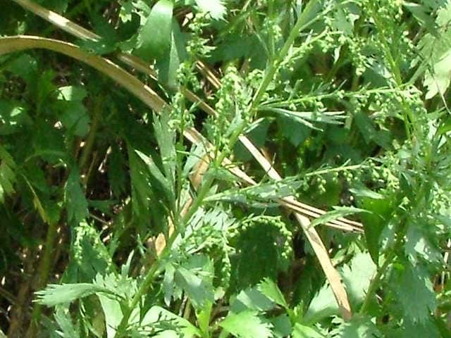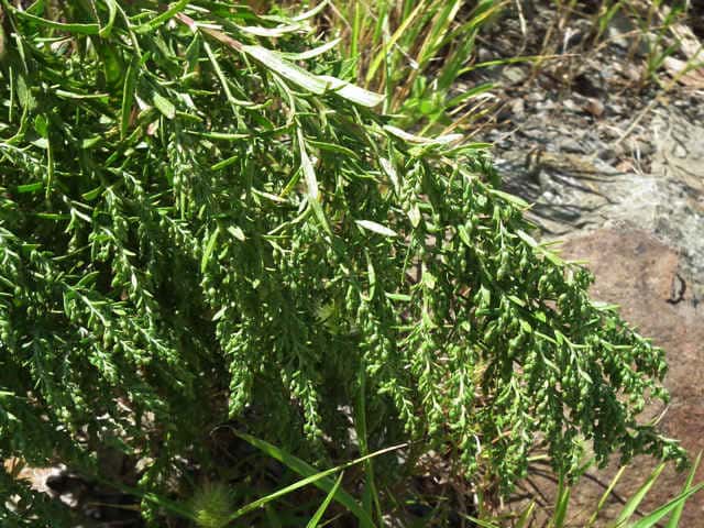 | 多年草 日本全土の山野にふつうに生える。全体にほとんど毛が無い。花をつけない茎の葉は長さ3.5〜8cmのへら形で、上半部に歯牙がある。花をつける茎は高さ0.5〜1mになる。中部の葉は普通長さ4〜8cmのへら状くさび形で、上半部に歯牙があるものから羽状に切れ込むものまで変化が多い。頭花は円錐状に多数つき、直径1.5mmの卵形。花期は8〜11月。(野に咲く花) 学名は、Artemisia japonica キク科ヨモギ属 |