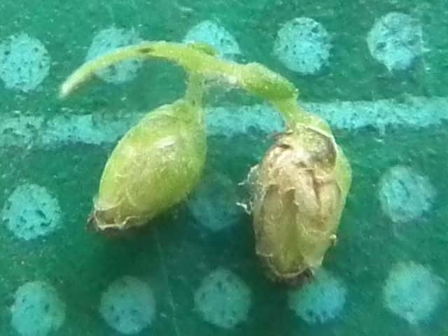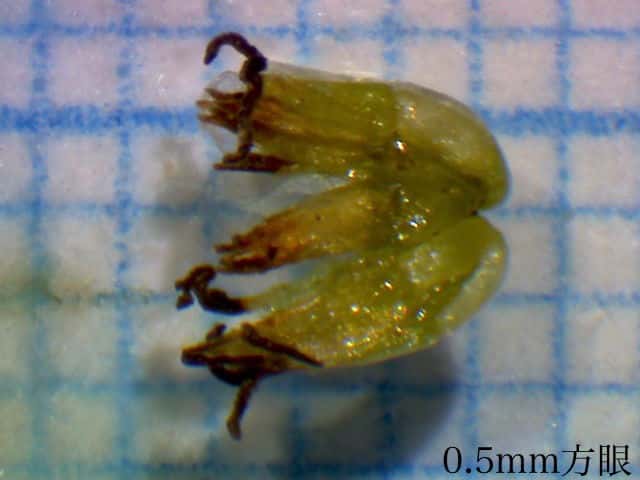 | ▼両性花、長さ約1.5mm。 | ▼花筒の中に雌しべと雄しべがある。 | ▼雌性花、長さ約1.5mm、柱頭が2裂する。 |