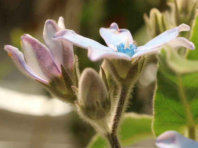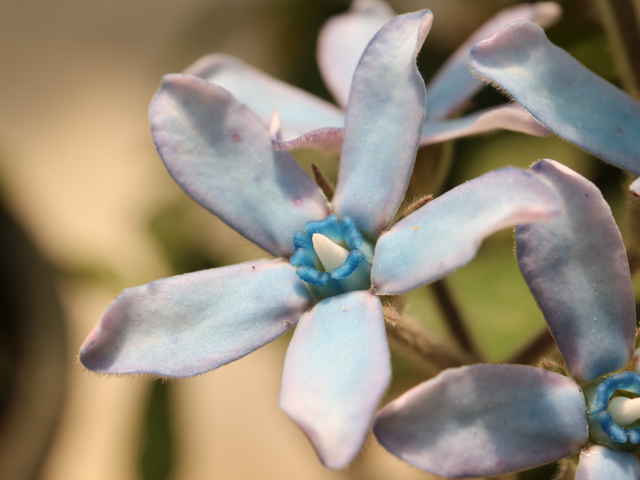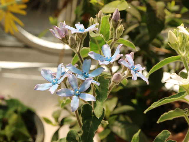 | つる性多年草 高さ30~80(100)㎝、茎を傷つけると毒性のある白色の乳液が出る。全体に白色の綿毛に密に覆われる。葉は対生し、葉身は灰緑色、三角状長楕円形、長さ7.6㎝以下、基部は心形、全縁、先は鋭形~鈍形。花序は頂生及び腋生、複合集散花序、長さ30~40㎝、1つの集散花序に花が4(5)個程度つく。花は放射相称、星形、直径2~3㎝。萼は5深裂、裂片は披針形、尖鋭頭。花弁5個、淡青色、平開し、古くなると紫色に汚れ、ピンク色になる。副花冠は先が青色。子房は上位、2心皮。果実は袋果、細長い紡錘形、熟すと縦に裂開する。種子には長い白色の種髪があり、風で散布される。花色は青、白。別名オキシペラタム、ブルースター。花期は6〜9月。(三河の植物観察) 学名は、Oxypetalum coeruleum キョウチクトウ科ルリトウワタ属 |