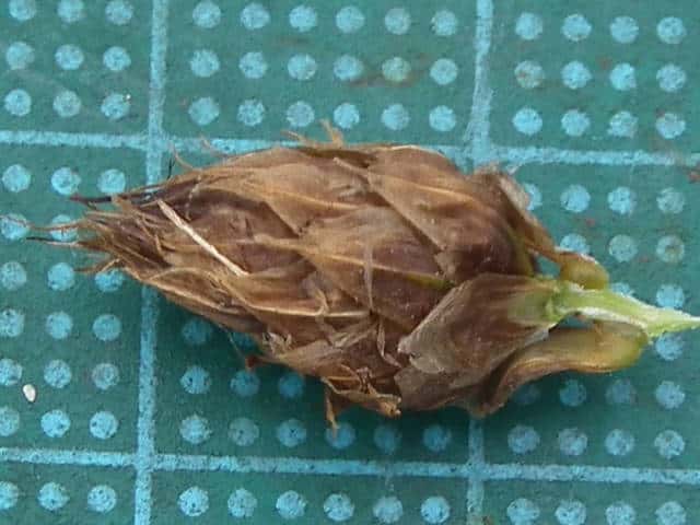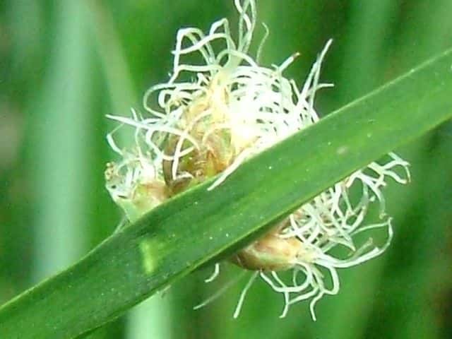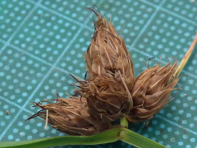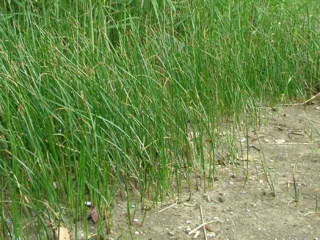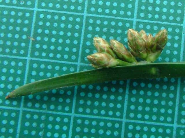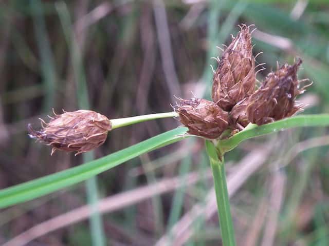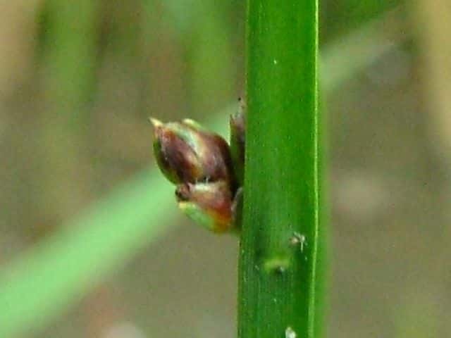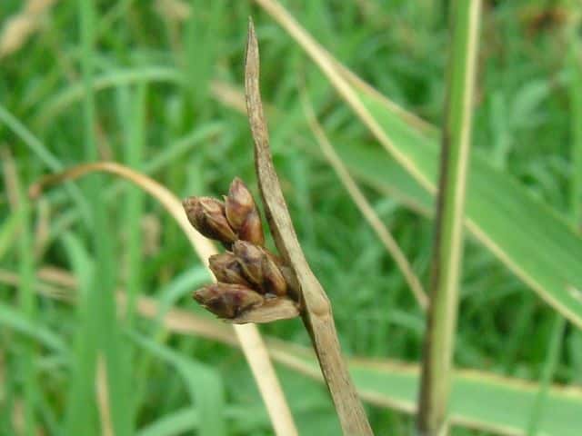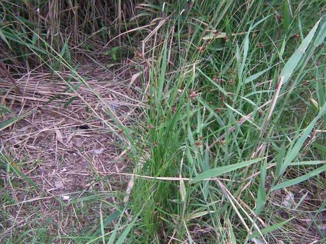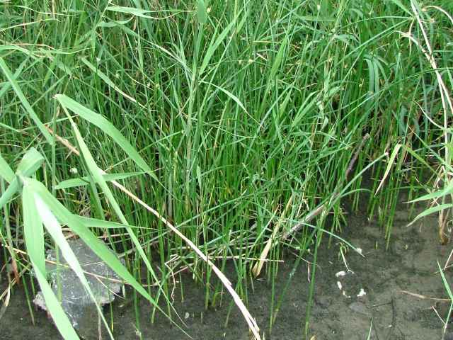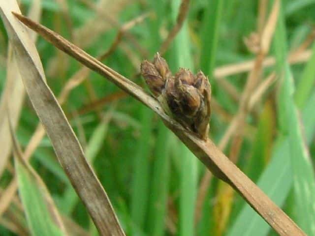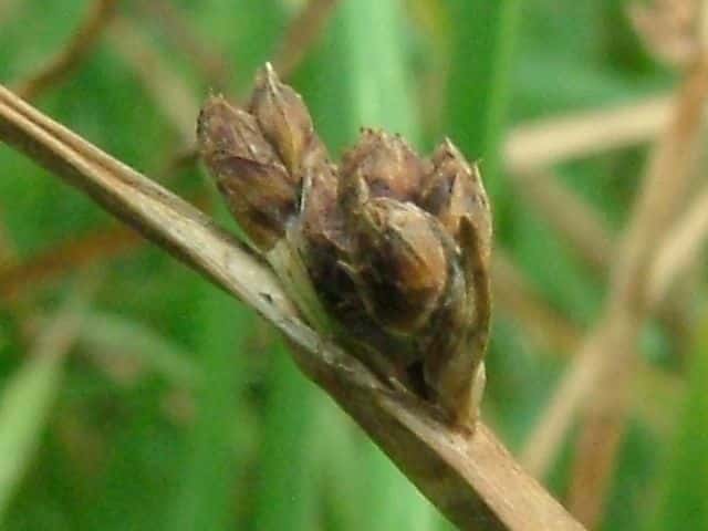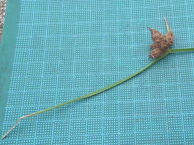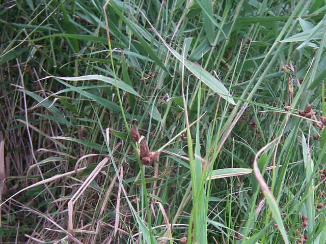 | 多年草 北海道〜九州の池や川の周辺の湿地に多い。植物体は叢生せず、長く横に這う匍匐根茎がある。稈は高さ50〜100cm、横断面は鋭3稜形。花序は束生、4〜10個の小穂からなり、短い柄を持つものと持たないものがある。苞葉の葉身は稈に続き、長さ2〜5cm。小穂は卵形、長さ7〜12mm、茶褐色。鱗片は広倒卵形、長さ約4mm、円頭、上部の縁はざらつく。そう果は倒卵形、長さ2〜2.5mm、横断面はレンズ形。刺針状花被片は3〜5個、そう果とほぼ同長またはやや長く、下向きにざらつく。柱頭は2個。花期は7〜10月。(岡山県カヤツリグサ科植物図譜) よく似たカンガレイは、株状になり、花序に枝がない。 学名は、Schoenoplectus triqueter カヤツリグサ科フトイ属 |