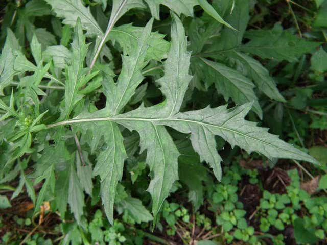 | ▼1個の筒状花、冠毛は長さ約1cm。 | ▼中部の葉は長さ約50cm、不規則に深裂する。 | |