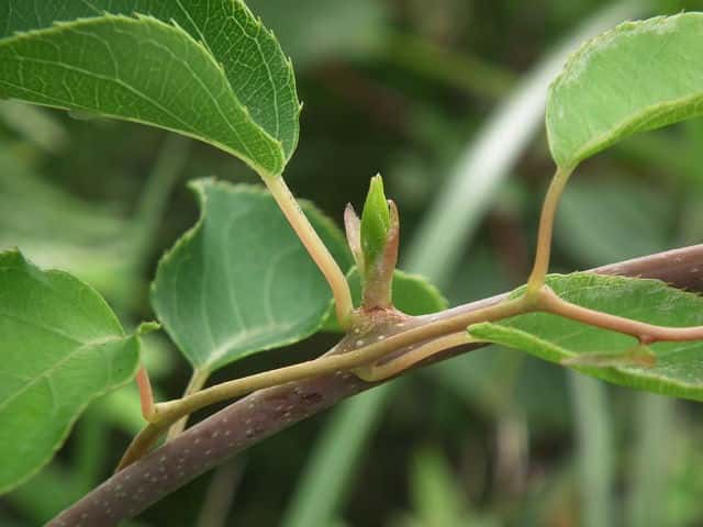 | 落葉つる性木本 本州〜九州の山地の林内や林縁に生える。枝ははじめは褐色の軟毛が密生するが、のちに無毛。葉は互生。葉身は長さ6〜10cm、幅4〜7cmの楕円形〜広卵形。厚い革質で、ふちには刺状の鋸歯がある。裏面の脈上にはかたい毛が生える。葉柄は長さ2〜8cmで淡紅色を帯び、かたい毛と軟毛がある。上部の葉腋に白い花を下向きにつける。花は直径1〜1.5cm。花弁と萼片は5個。葯は黒紫色。両性花の花柱は線形で多数あり、放射状に開出する。果実は液果。長さ2〜2.5cmの広楕円形、10〜11月に緑黄色に熟す。種子は多数あり、長さ2mmほどの楕円形。花期は5〜7月。 冬芽は、隠芽。隆起した葉枕に隠れている。(樹に咲く花) 学名は、Actinidia arguta マタタビ科マタタビ属 葉裏が粉白色のものをウラジロマタタビといい、関東以西〜九州に分布する。樹皮は褐色を帯び、表面は粗く繊維質。 サルナシの樹皮は灰白色で、滑らかで薄くはがれる。 |
