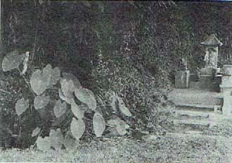 | 「農耕の技術」10号青葉 高「石芋伝説のサトイモについて」 (1987) ー略ー 4)松江市芋谷の食えん芋 ー略ー この大野町の芋谷と呼ばれる谷に小さな井戸と石地蔵があり、その井戸に弘法芋、俗に大野の食えん芋と呼ぶサトイモが自生している。ここには以前土居の寺という寺院があったというが今はない。このサトイモについては他の石芋と同様,弘法大師と欲深い老婆との言い伝えがあり、老娑の捨てた芋が芽を出し、それが今日まで生き続けているといわれる(『大野郷土誌』、『島根の伝説』など)。 清水誠一、吉田正温両氏の案内で現地を調査したが、井戸というのは縦3m、横1m あまり、深さ30cmほどの小さい泉で、水は後方の繁みからしみ出る程度で、水の流れはみられない。しかし水の涸れることはないという。サトイモはこの泉の傍にかたまって生えているほか、付近の道ばたにわずか生育し、株数はそれ程多くなかった。(写真5) サトイモの形態は沓掛の石芋に類似し、子芋の基部はやや長いが葡旬枝ではない。筆者が関東で試作したところ沓掛のサトイモに類似し耐寒性は強かった。 上述のようにこの食えん芋は普通の水溜りの傍に生育するもので,沓掛や関金のような湯尻ではなく,甲府のような温い湧き水地でもない。大野公民館長の佐藤正義氏によると,このサトイモは同氏が子供の頃と比べてほとんど増減がなく、旱魃、厳寒や大雪の年もあつたが春になると変りなく毎年芽を出すという。なお『大野郷土誌』によると、先年恩田清氏は,この芋を『出雲風土記』 に記されている芋草、芋菜とし、これはサトイモの原種ではなかろうかと推定している。 ー略ー このような考え方にたてば、平均気温が現在より2〜3℃高かった縄文時代前、中期前半に渡来した原始型のサトイモが、東日本までも伝わり、広く分布したが、その後縄文晩期から弥生時代にかけて平均気温が現在より1℃程度低くなった時期に、その多くは絶滅し、 温泉地や湧き水のある場所など、生育条件に恵まれた地のサトイモだけが残存し、 その後も生育を続け、石芋、弘法芋などと呼ばれて現在も生育を続けているものと推定することもできる。 |