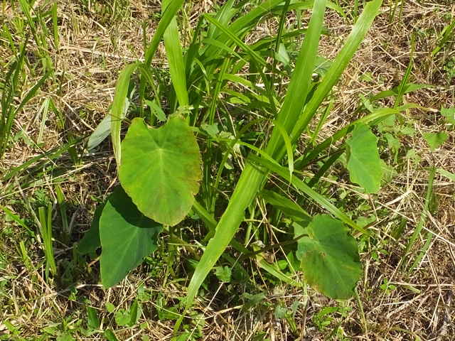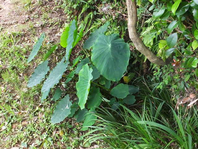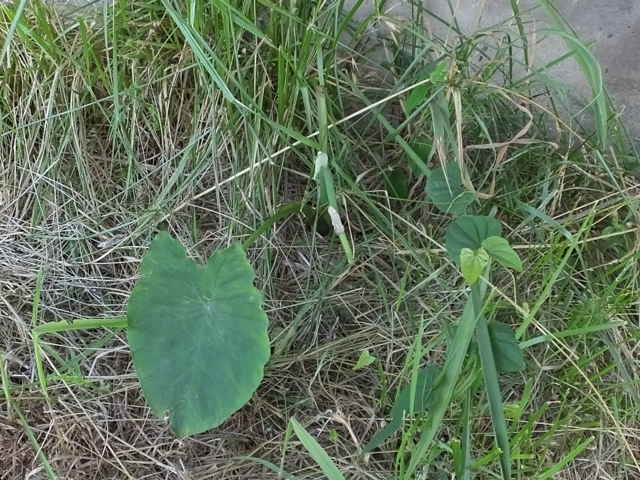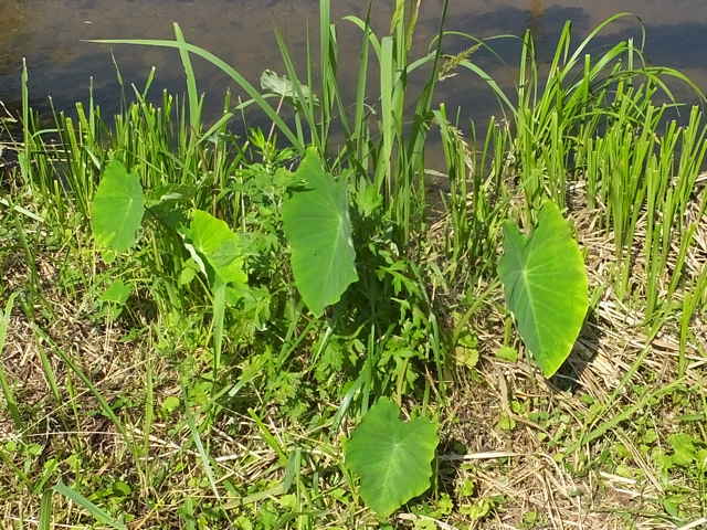 多年草 東南アジアの原産であり、1500年ほど前から栽培している。花はまれに咲くが果実は完熟せず、地下茎によって繁殖し、現在の品種の多くは少なくとも300年以前から栄養繁殖を続けている。畑に栽培するが時に暖地の湿地に野生化する。地下茎は球形または倒卵形で、横に子いもができる。葉の高さ8〜120cm。葉柄は深緑色から紫褐色、葉身は象の耳のようんs形で、基部深く湾入し、湾入部から少し下がって楯状につく。葉鞘の底から1〜4個の花序をだす。花序は有柄。苞は直立し、長さ30cm内外、筒部は緑色、舷部は披針形、黄色。肉穂は苞より短く、下部は雌花、つぎに仮雄花、その上に雄花があり、その上は仮雄花となる。雄花に6雄ずいがある。花期は8〜9月。(原色日本植物図鑑) 学名は、Colocasia esculenta サトイモ科サトイモ属 「農耕の技術」10号青葉 高「石芋伝説のサトイモについて」 (1987)の中で松江市上大野町に古くから生えているサトイモが紹介されている。(最下段) |