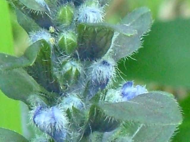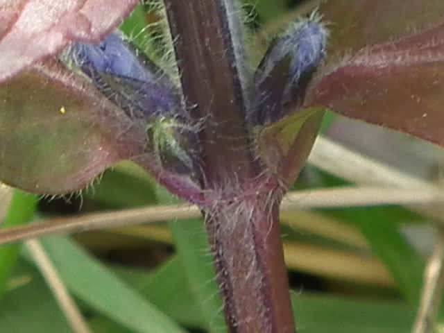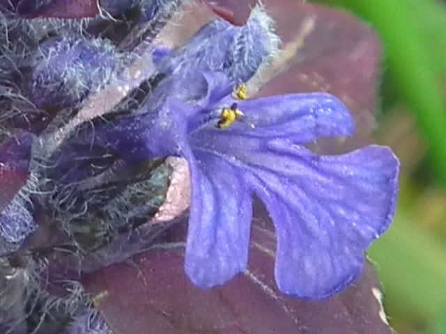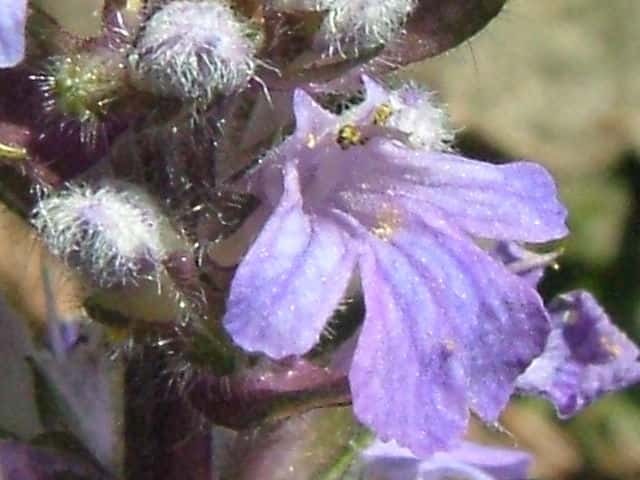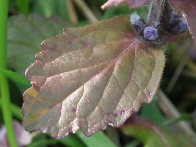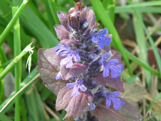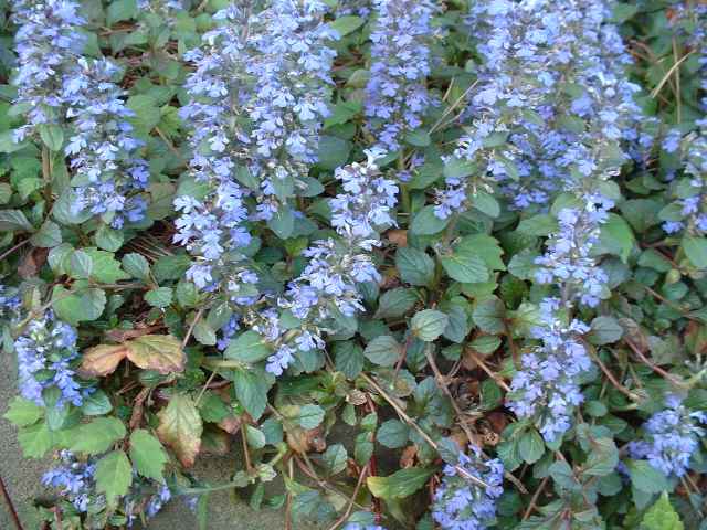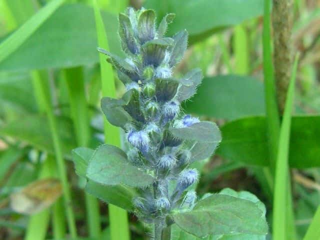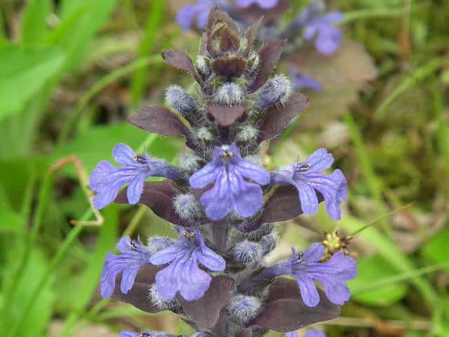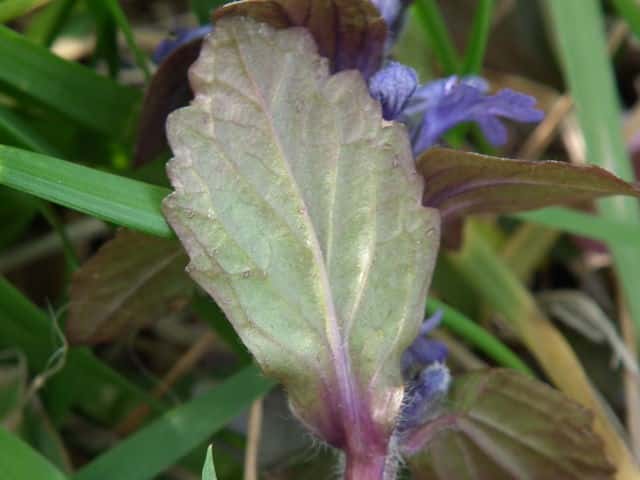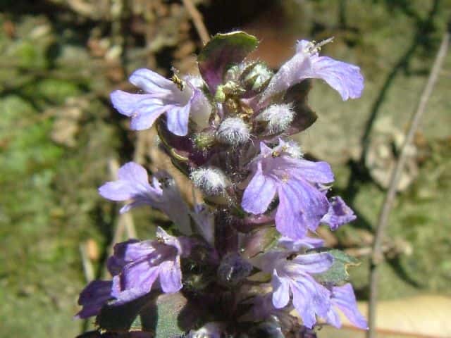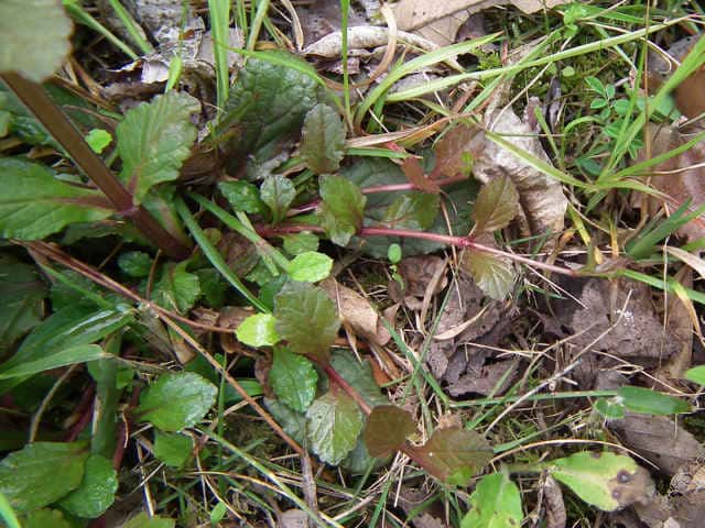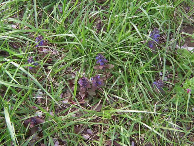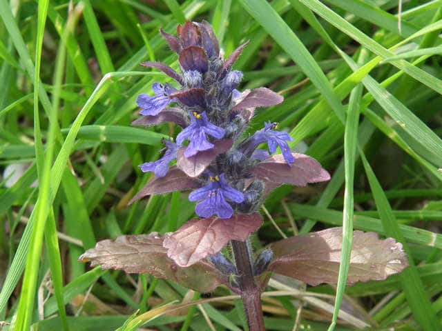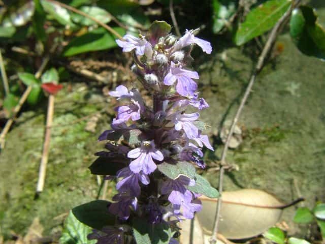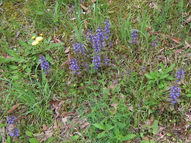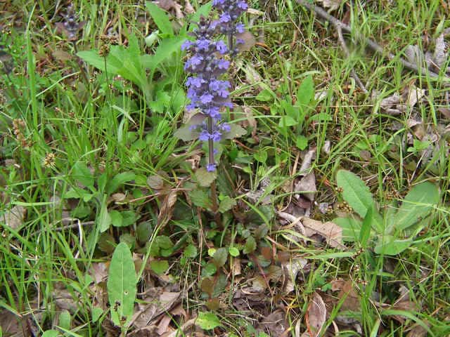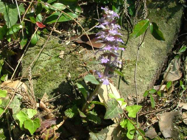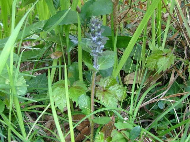 常緑多年草 北ヨーロッパ原産。観賞用に栽培されていたが、1970年頃から逸出して野生化することが認められだした。水田の畦畔を被うために導入されているが、各地で逸出している。常緑で秋から春にかけて全体に紫色を帯びる。開花時期に地上を這う茎を伸ばし、節から発根して新しい個体を生じてマット状に群生する。四角形で高さ30cmほどの花茎を伸ばし、対生する葉状の苞の腋に、長さ1cmほどの青紫色〜白色の唇形花を3〜10個穂状につける。花期は春〜夏。(日本帰化植物写真図鑑) 別名セイヨウキランソウ、アジュガ。 学名は、Ajuga reptans シソ科キランソウ属 |