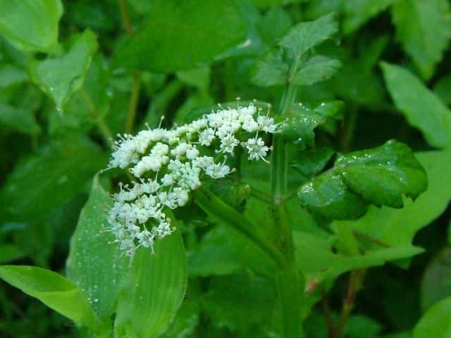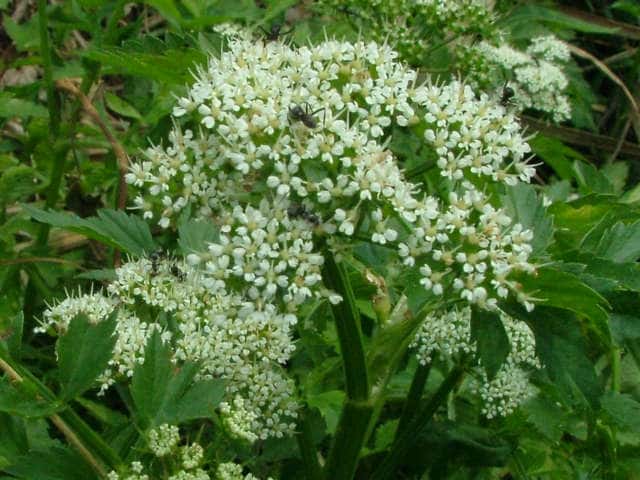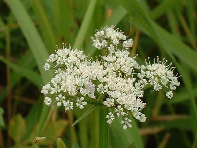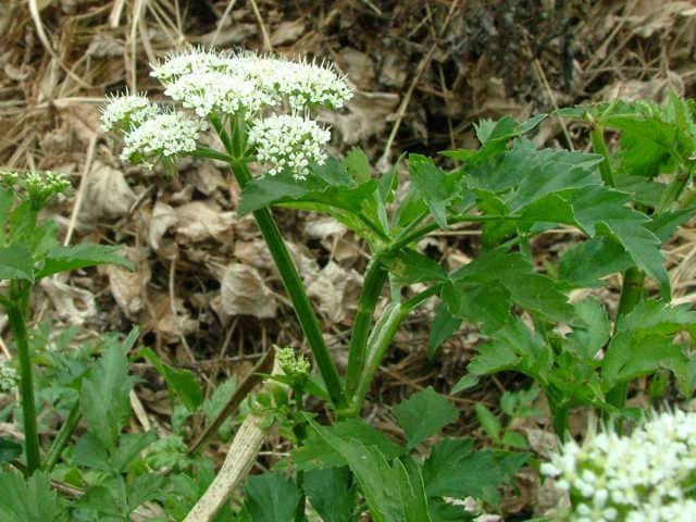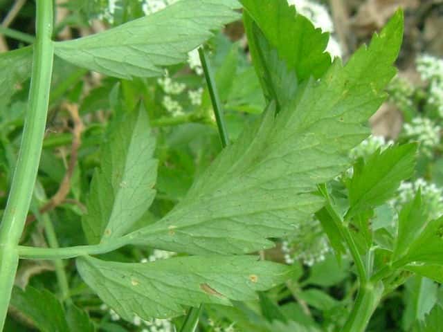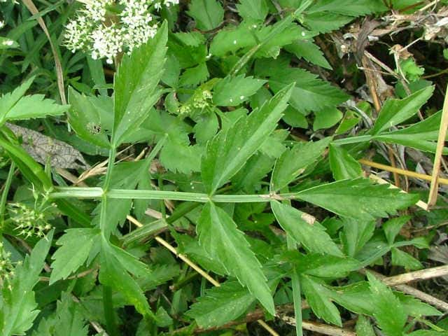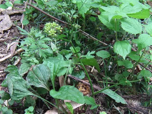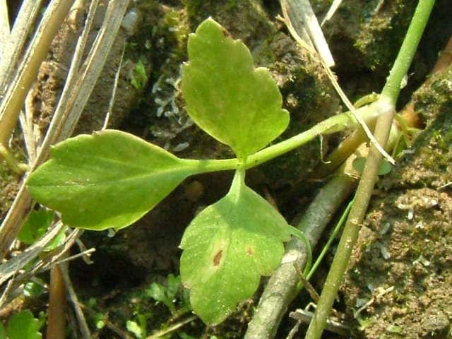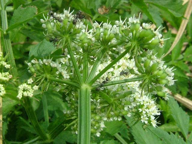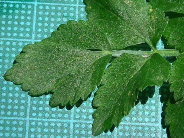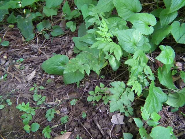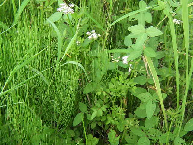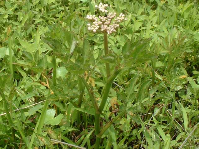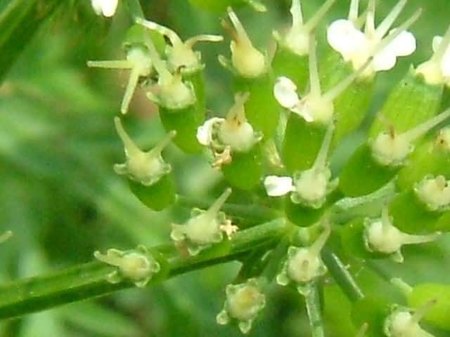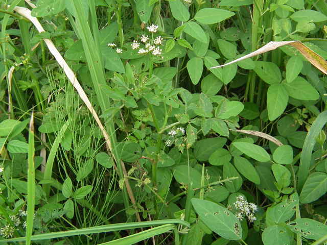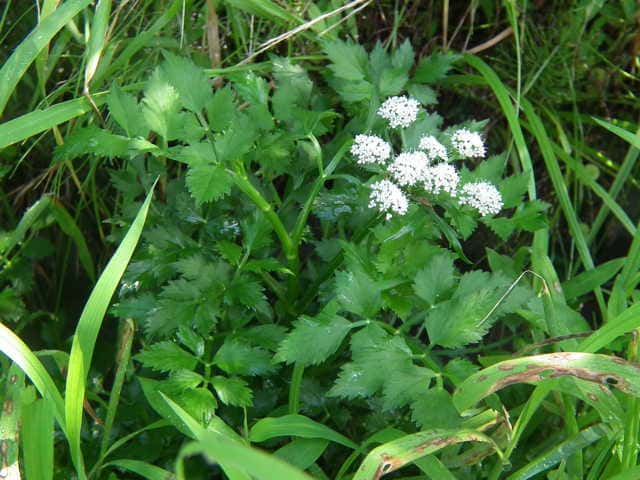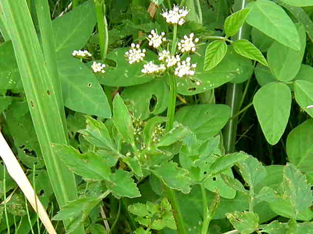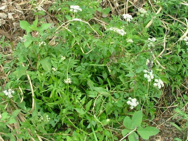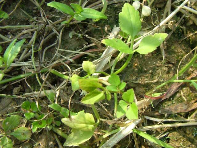 | 多年草 日本全土の水田や溝、小川、湿地などに生える。高さ20〜50cm。地下茎をのばし、秋に節から新芽をだしてふえる。葉は1〜2回3出羽状複葉でやわらかい。小葉は卵形でふちには粗い鋸歯がある。茎先から複散形花序をだし、白色の小さな花を多数つける。果実は長さ約3mmの楕円形。隆起線はコルク質で、すべて太くて低い。花期は7〜8月。(野に咲く花) 学名は、Oenanthe javanica セリ科セリ属 |