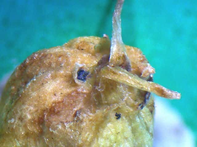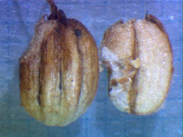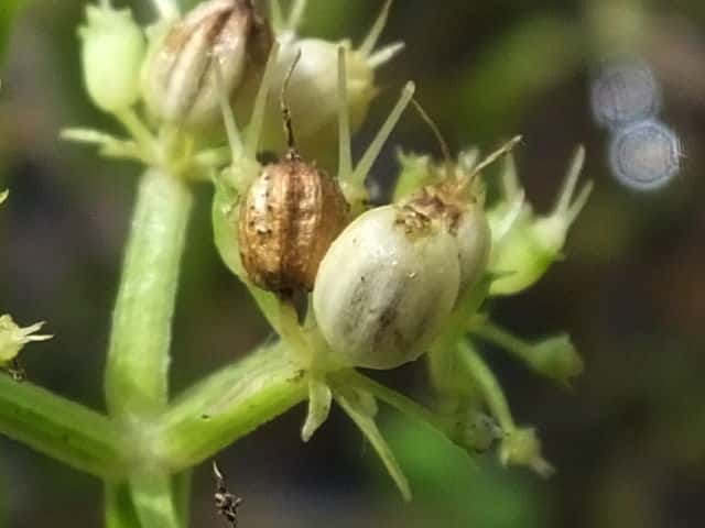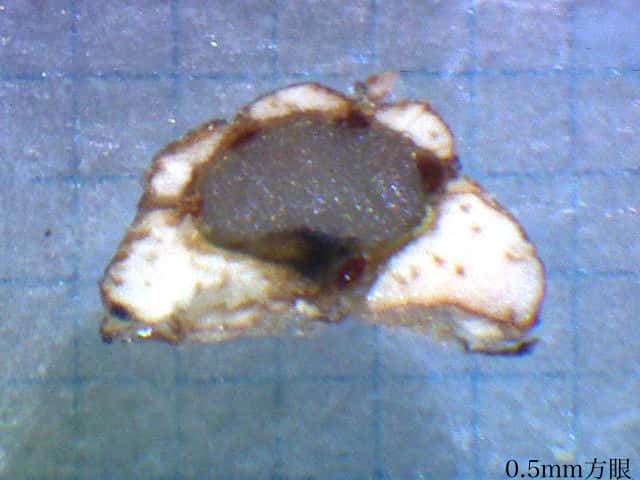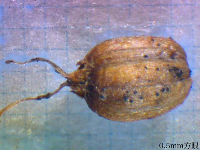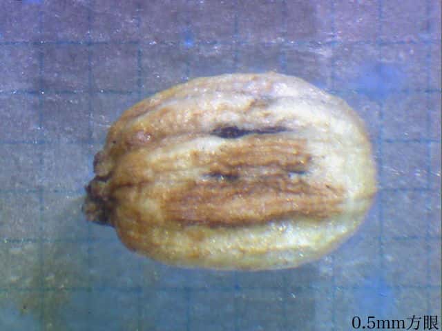 | ▼果実は長さ2.5〜3mm。 | ▼果実の先端に花柱と萼歯が残存する。 | |