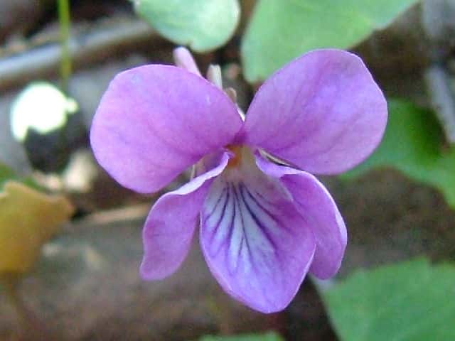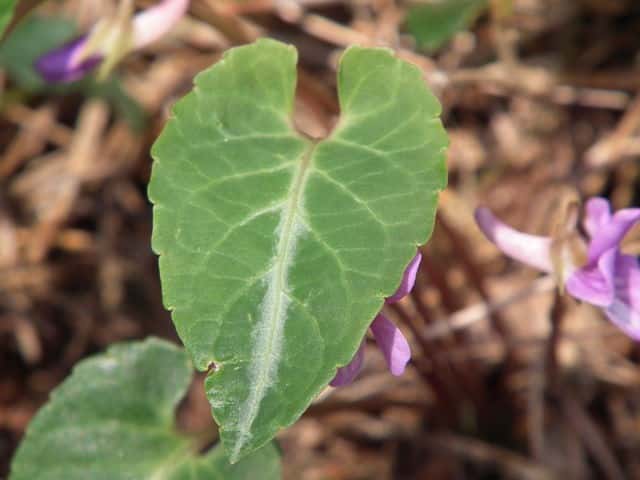 | 葉の中央脈のみにに斑が入るものはコンピラスミレ(f.pictifolia)という品種に分類される。 | ||