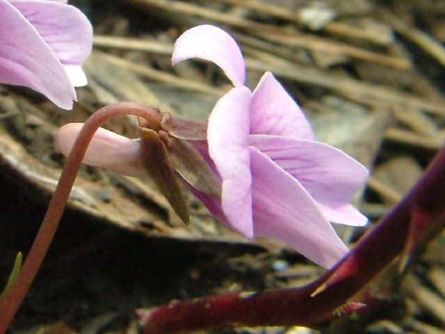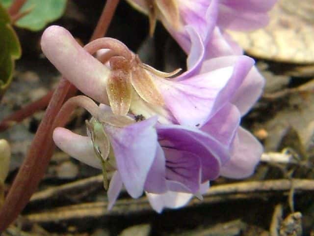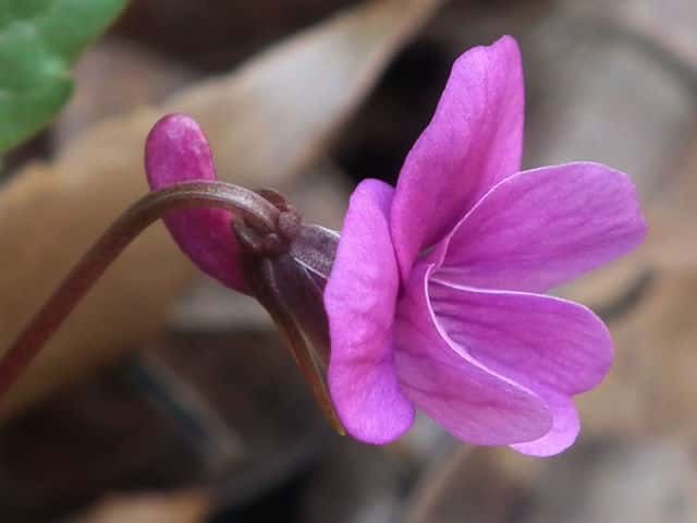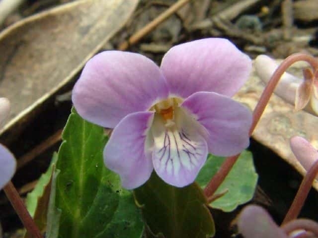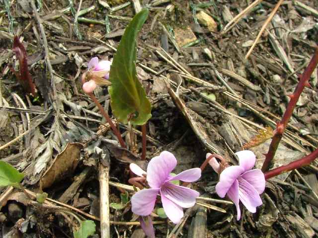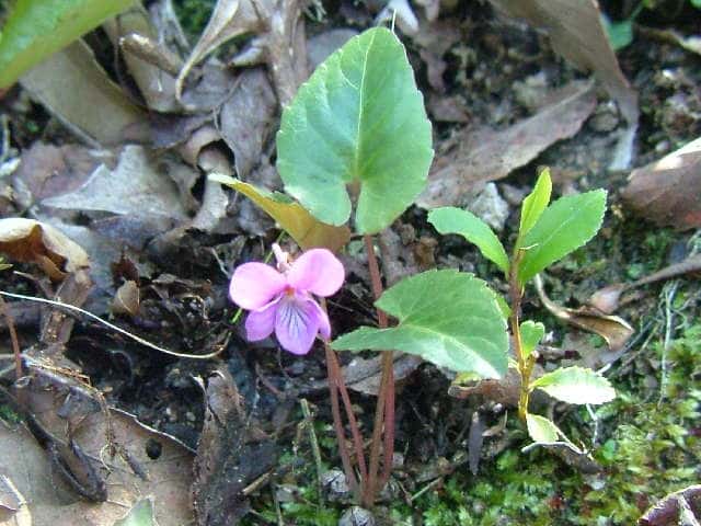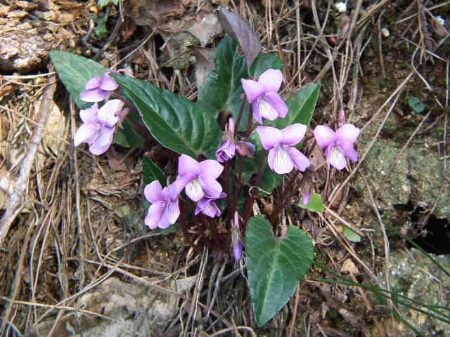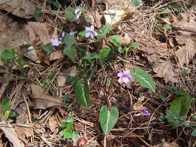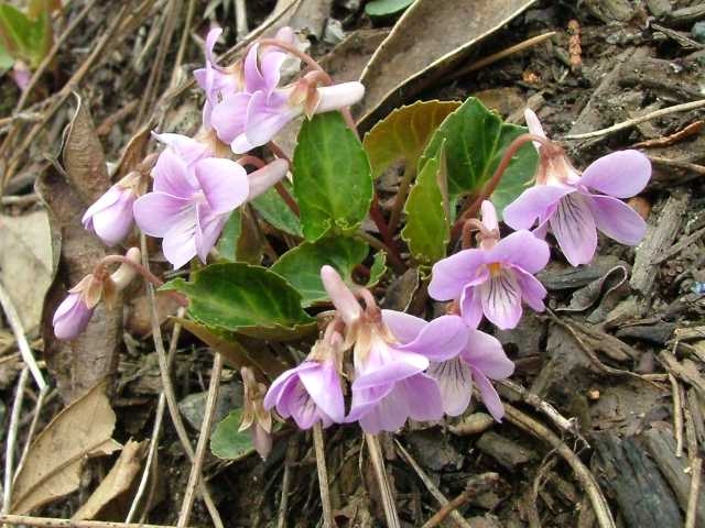 | 多年草 本州(中部地方以西)〜九州の日当たりのよいところに生える。高さは5〜8cm。葉は光沢があり、花期には長さ1.5〜5cmの三角状狭卵形。裏面が赤紫色を帯びる。花は淡紅色〜濃紅紫色。花弁は長さ0.8〜1.2cm。側弁は無毛。唇弁には紫色のすじがある。距は長さ5〜6mmで細く、後ろに跳ね上がる。萼片の付属体は全縁。花期は4〜5月。(野に咲く花) 学名は、Viola violacea スミレ科スミレ属 葉の表面の葉脈に沿って白い斑が入るものをフイリシハイスミレ(f.versicolor)、中央脈のみに斑が入るものをコンピラスミレ(f.pictifolia)、また葉の表面が黒紫色〜暗紫紅色に色づくものをハグロシハイスミレ(通称)という。 スミレの分類 |