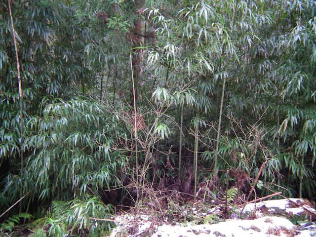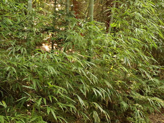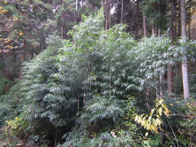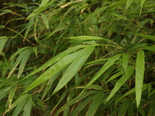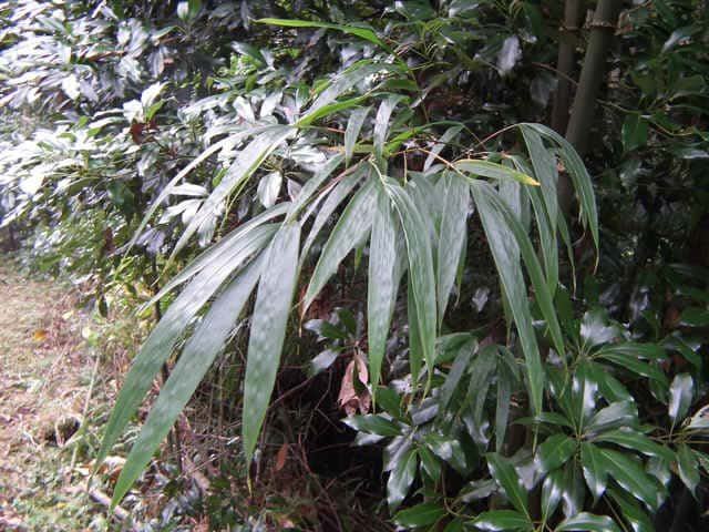 | 竹 中国原産。主に関東地方以西で栽培される。高さ5〜7m、稈の直径3〜4cmになる。断面は角の丸い四角形。稈面に小さな刺が散在し、なでるとざらつく。下部の節から気根をだす。中部以上の節には発達の悪いいぼ状の気根が輪生する。枝は1節から3〜7個でる。葉身は長さ14〜20cm、幅14〜20mm。先端は垂れ下がる。裏面にははじめ毛がある。肩毛はほぼ直立する。葉耳は発達せず、葉舌は低くほとんど見えない。筍は秋にでて美味。(樹に咲く花) 学名は、Chimonobambusa quadrangularis イネ科カンチク属 |