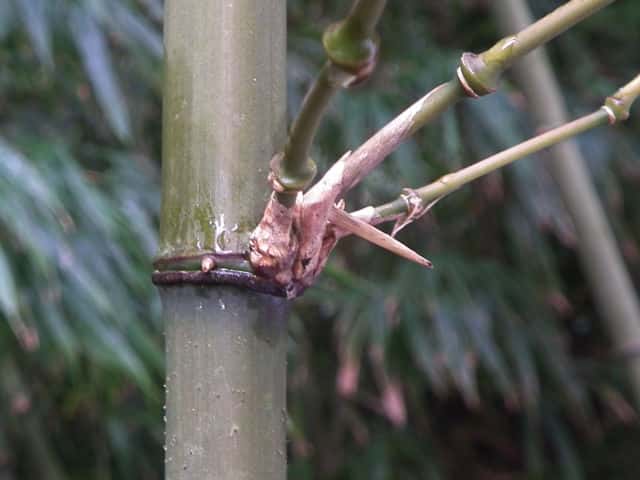 | ▼2014年1月23日 西長江 | ▼節にいぼ状の気根を輪生する。 | ▼枝を3本出す。稈に4稜がある。 |