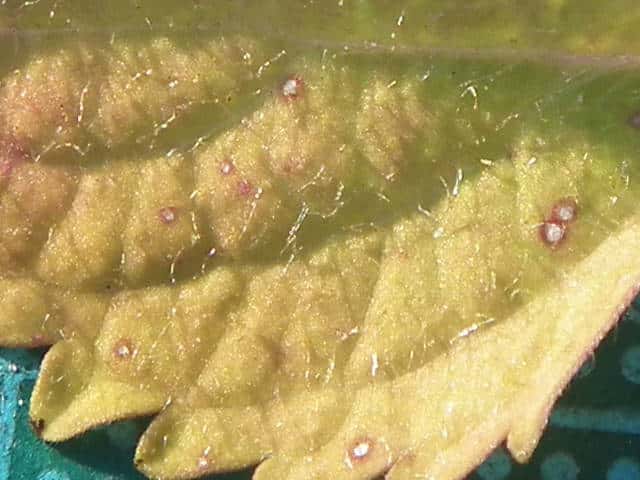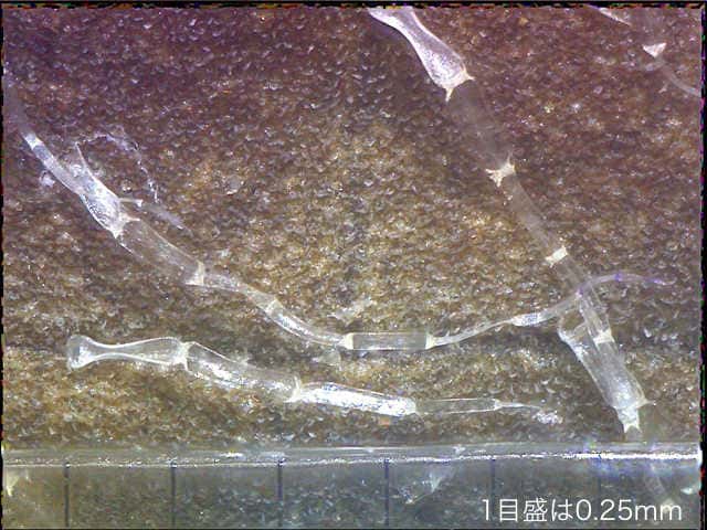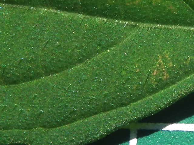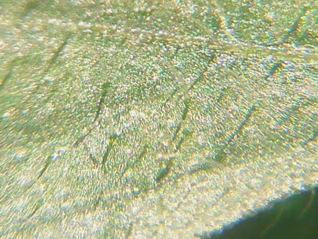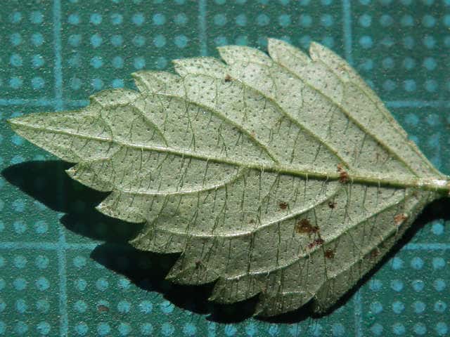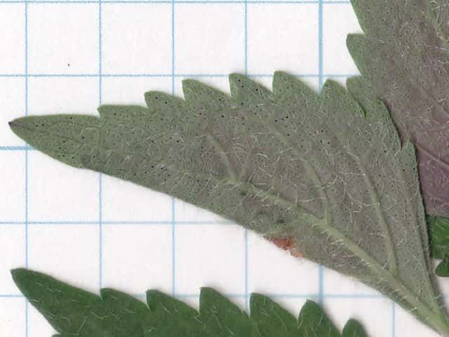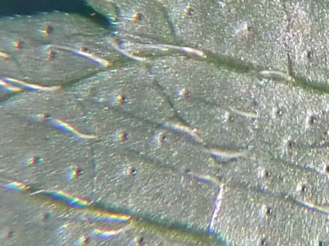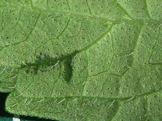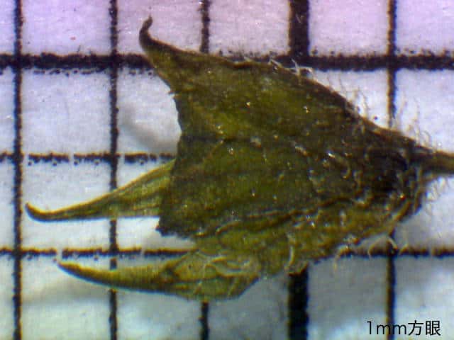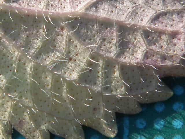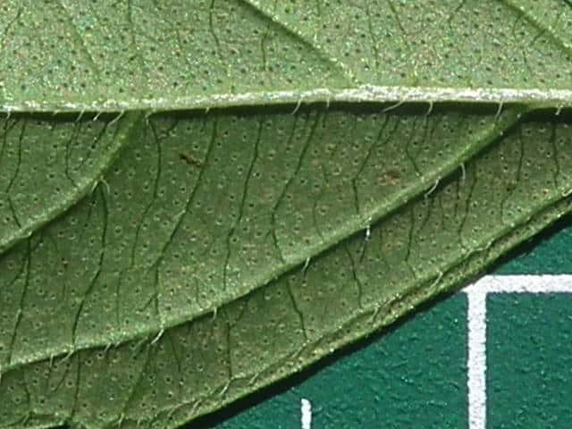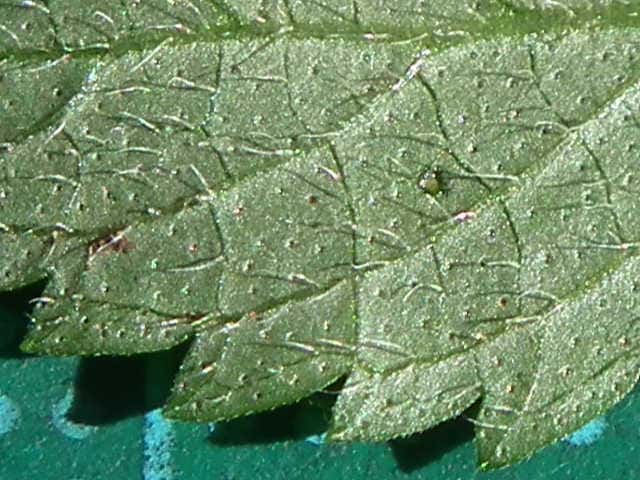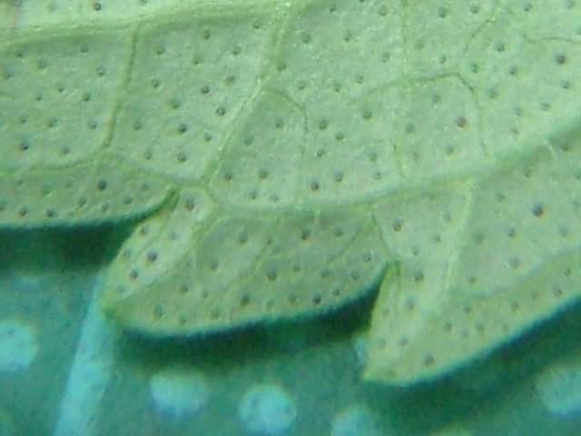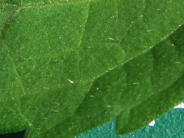 | ▼裏面 | ▼裏面に長毛と腺点がある。 | ▼長毛は長さ約1.5mm、腺点は長さ約0.1mm。 |