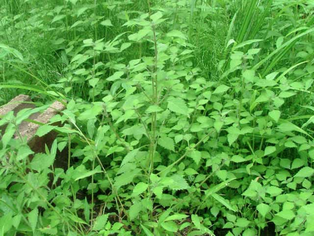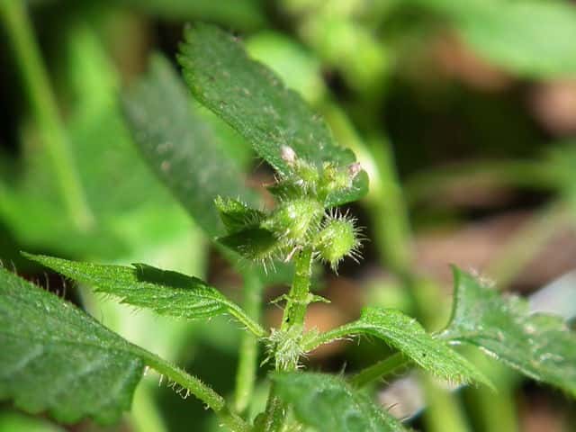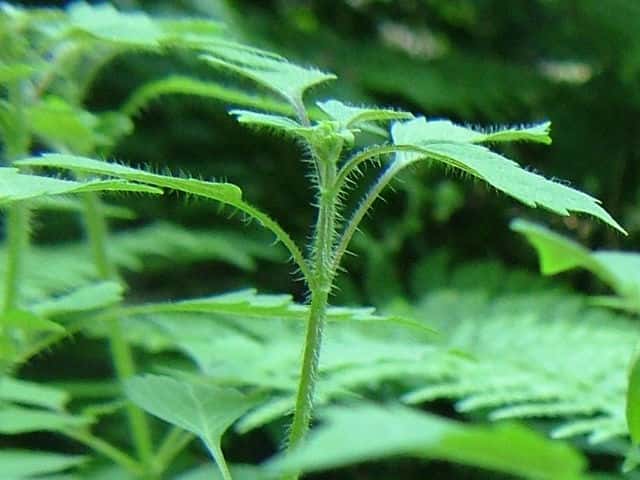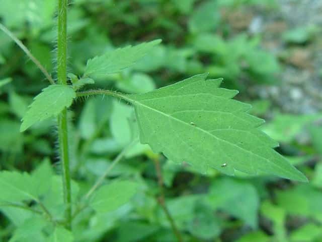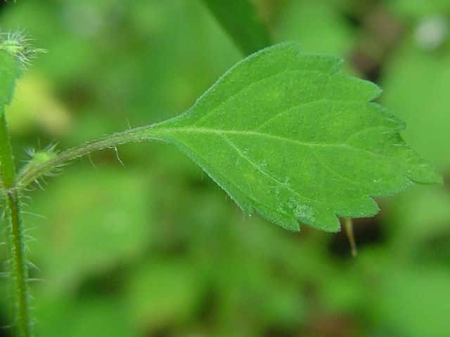 | ▼裏面脈上に長い毛がある。 | ▼茎には曲がった短毛がある。 | |