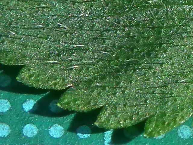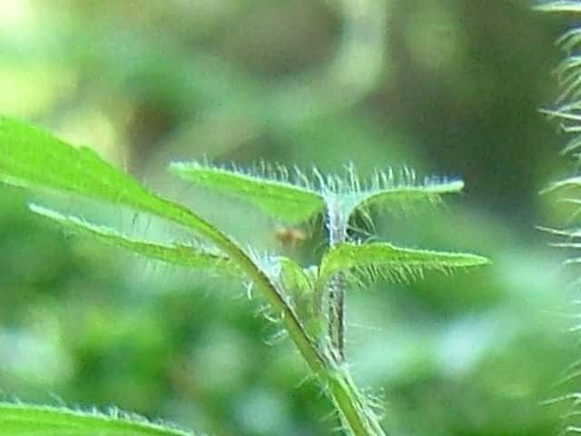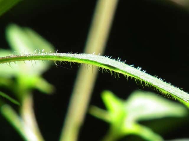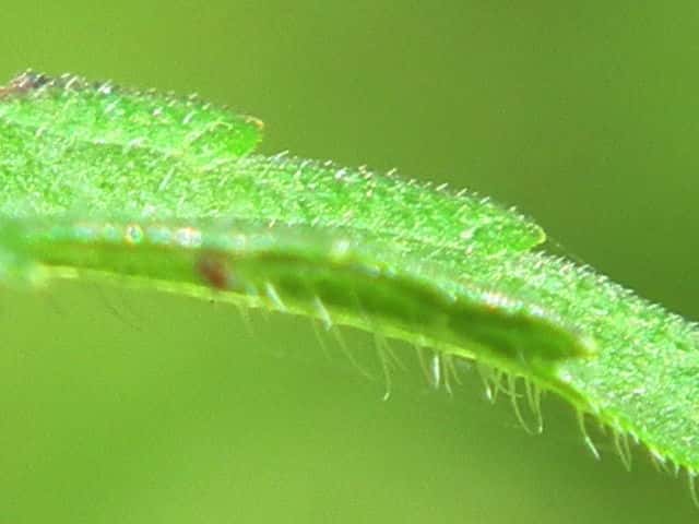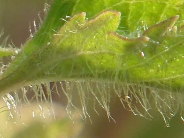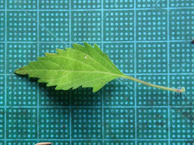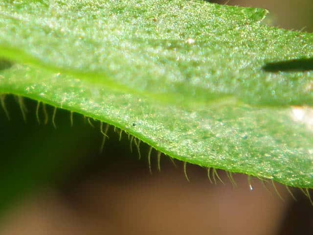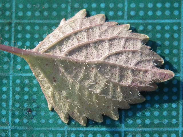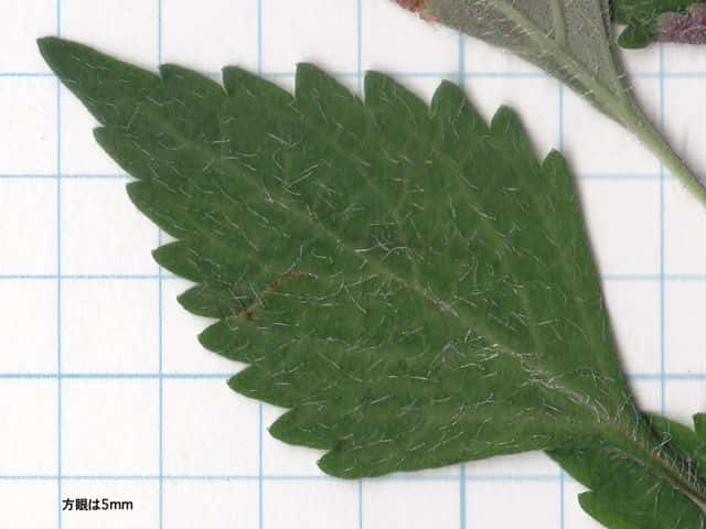 | ▼葉身は約3.5cm、鋸歯が片側8個ある。 | ▼表面はまばらに長毛がある。 | ▼表面の長毛、長さ約1.5mm。 |
