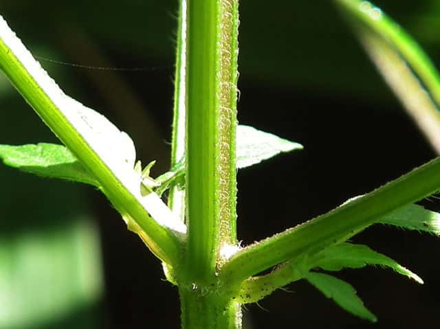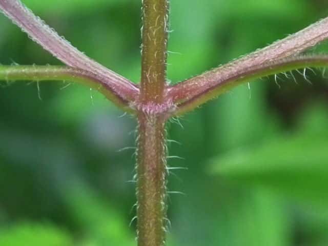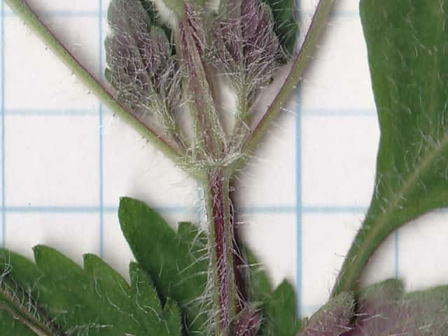 | ▼葉の両面や葉柄に白い開出毛が多い。 | ▼茎には下向きの短毛と開出した長毛がある。 | |