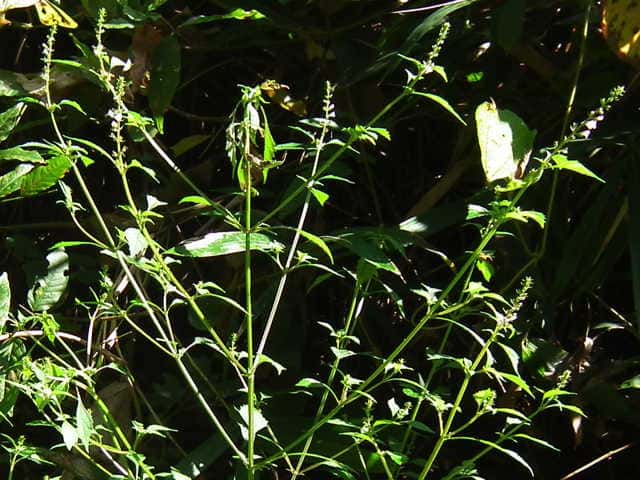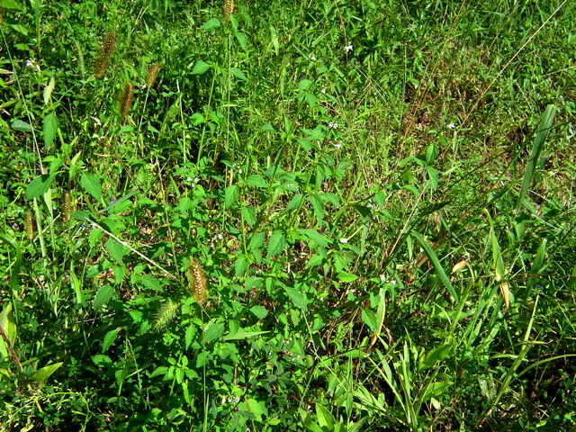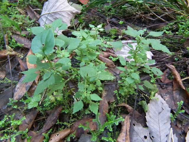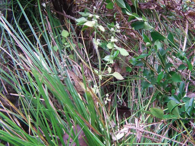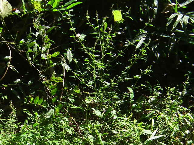 | 以下は花穂が伸びないことや茎の毛が短いなどシラゲヒメジソと違うような感じもするが、 大阪市立自然史博物館植物研究室に写真を見ていただき、「シラゲヒメジソの茎の長毛については変異が著しいので、この程度もシラゲヒメジソの変異の範囲と思います。ただし、花穂が伸びていないのが気になります。」との回答をいただきました。また、「ヒメジソは変異が大きくて、シラゲヒメジソと区別できないのではないかと思う。」との意見もあるとのことです。 花穂は’12年の観察でも短い。作業道の轍の中央にあるので、車両の通行によるものかもしれない。しかし長いものが1本もないのも不思議。道の両側には生えていない。 '13年には花穂の短いものがあった場所は樹木の成長によるのか日当たりがすっかりなくなってしまい、ヒメジソの成長が見られなかった。花穂が短かったのも日当たりの悪いためだったのかもしれない。少し離れた日当たりの良い場所には大きな個体で普通の花穂をつけたものが多数あったが、やはり茎には長毛がない。 |