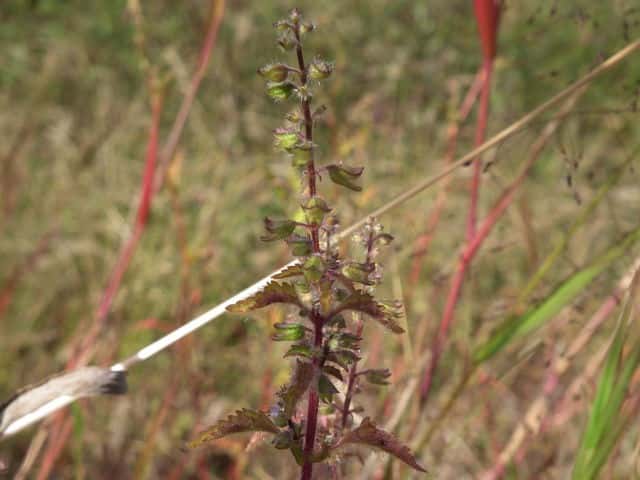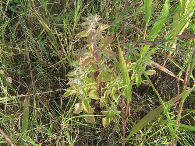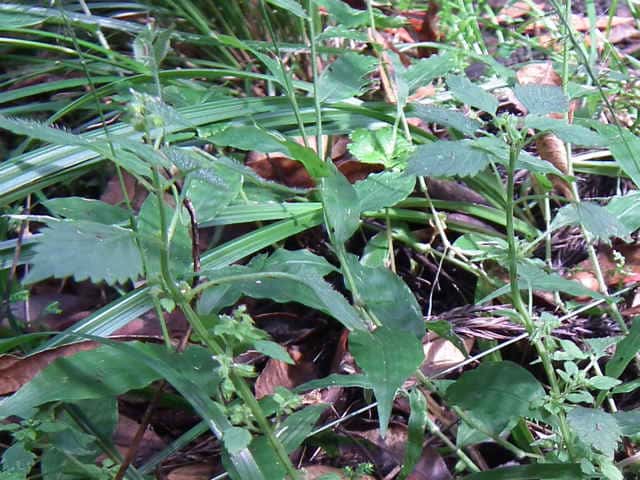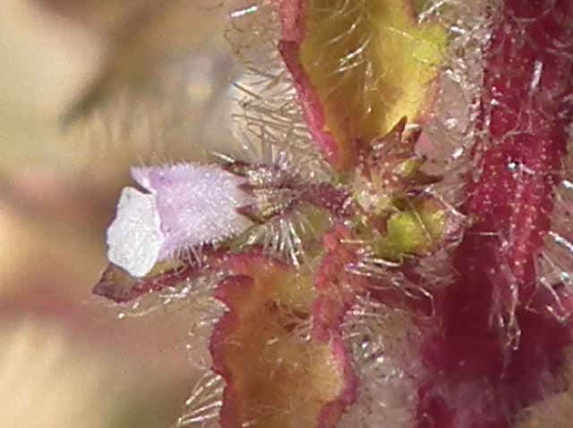 | 普通に見るシラゲヒメジソより毛深い。道路法面の日当たりのよい乾燥状態の場所にあるためか、茎は30cm程度で太く頑丈そうな感じがする。2013年には確認できなかった。 | ||