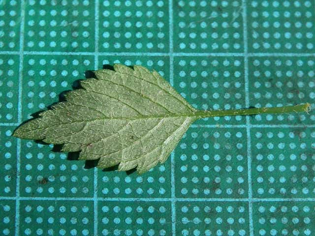 | ▼葉の裏面、葉柄に長毛がある。 | ▼葉身は長さ約2.5cm、葉柄は長さ約1.5cm。 | ▼表面は長毛がある。 |