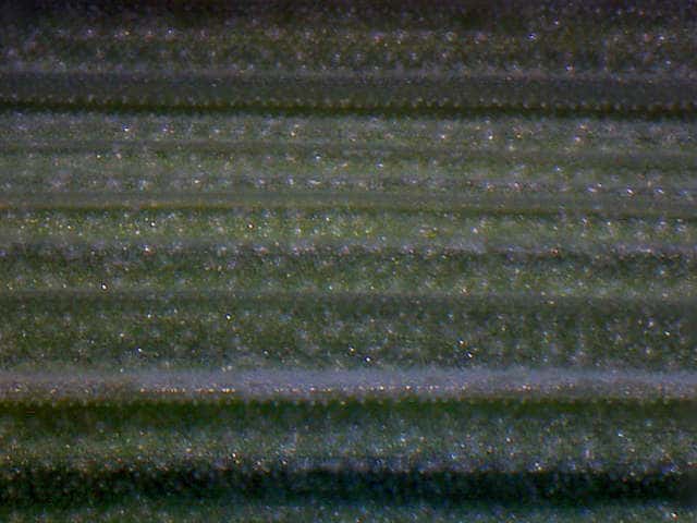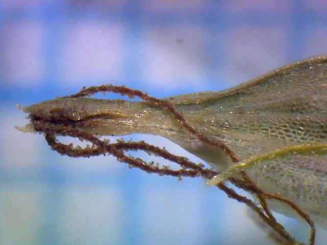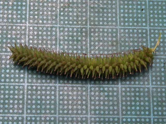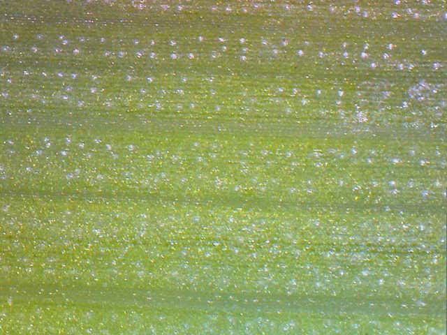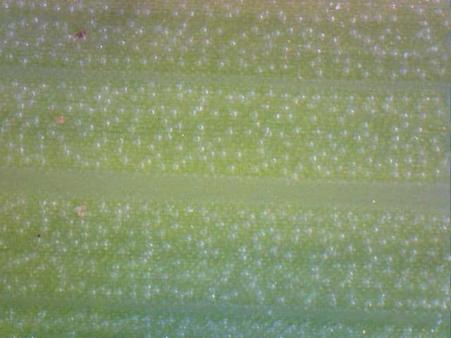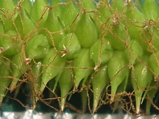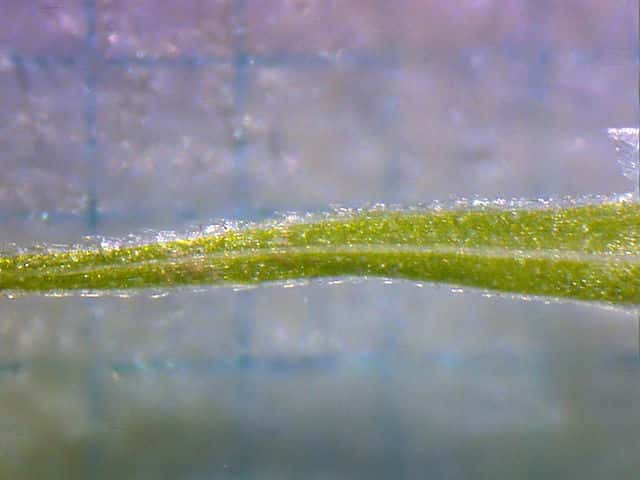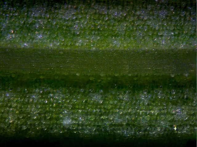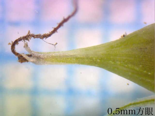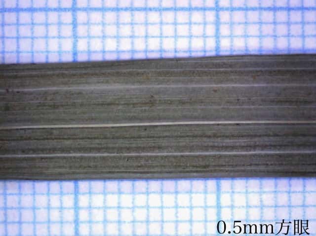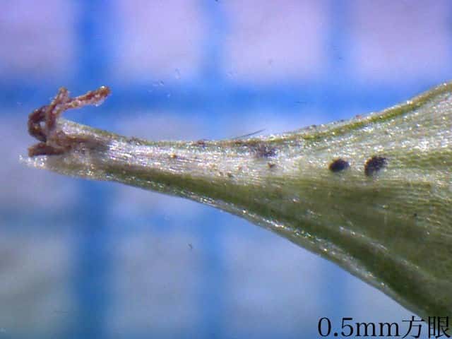 | ▼葉の幅は約1cm。裏面(上)。 | ▼葉の裏面には乳頭状突起が密生する。 | ▼葉の横断面。 |