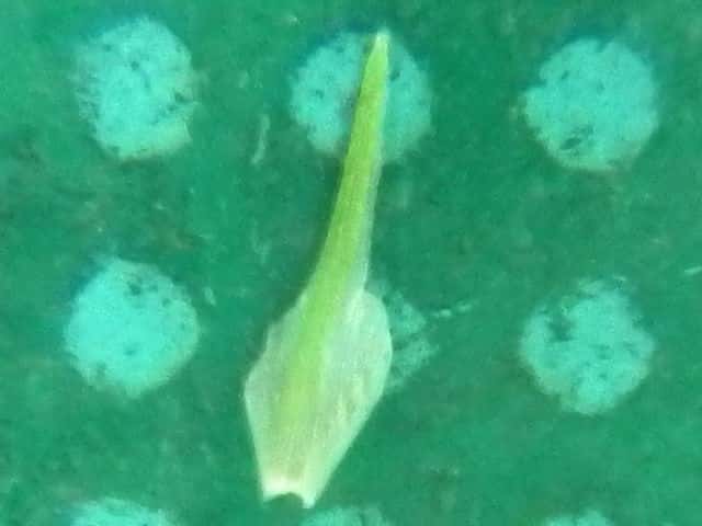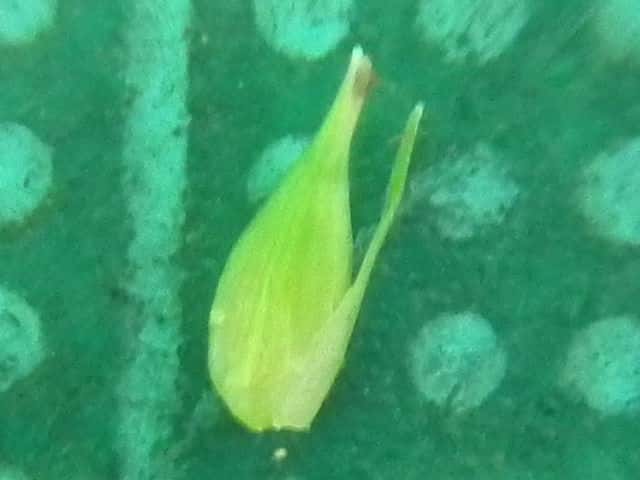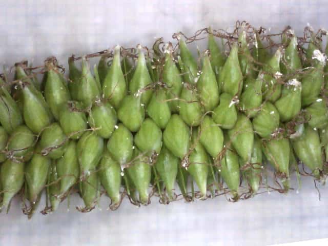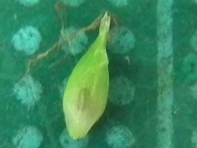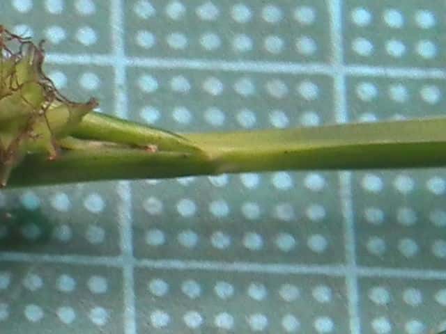 | ▼未熟な果実。 | ▼苞は無鞘。 | 葉は幅約10mm。 |