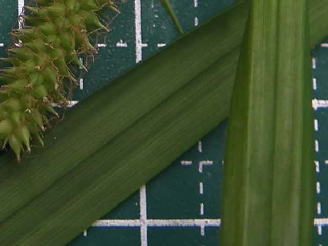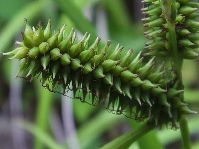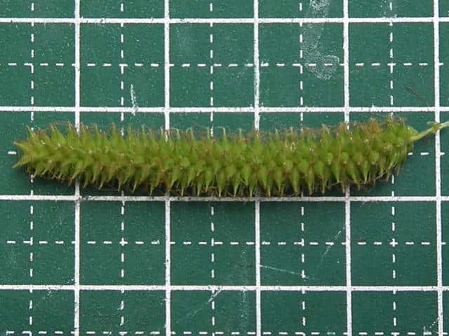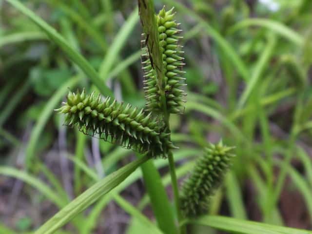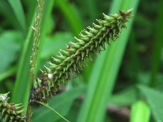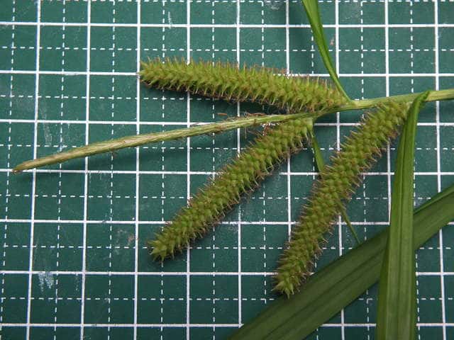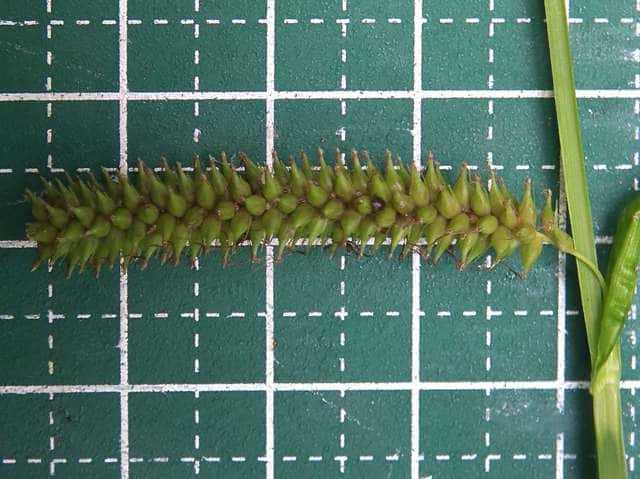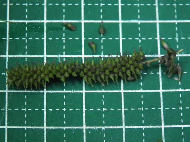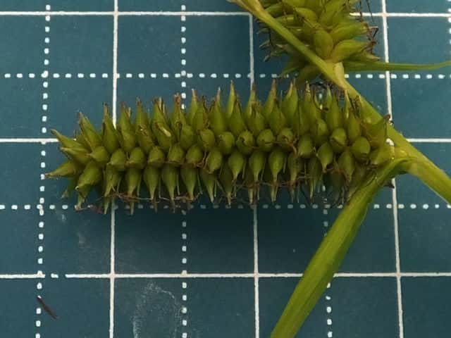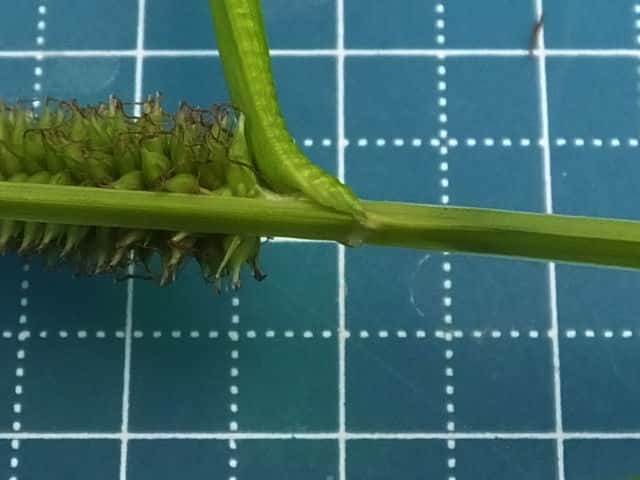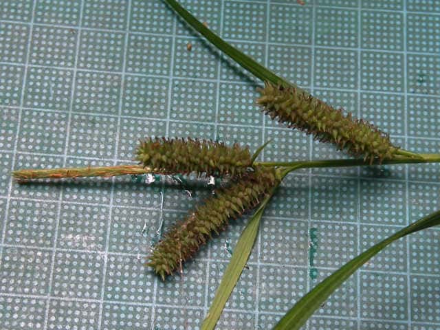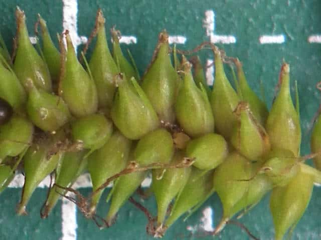 | ▼雌小穂は緑色、長さ4cm柄は長さ約5mm。 | ▼鱗片は果胞よりやや短い。 | ▼柱頭は3岐、果胞は長さ約4mm。 |