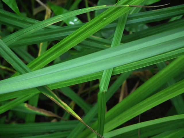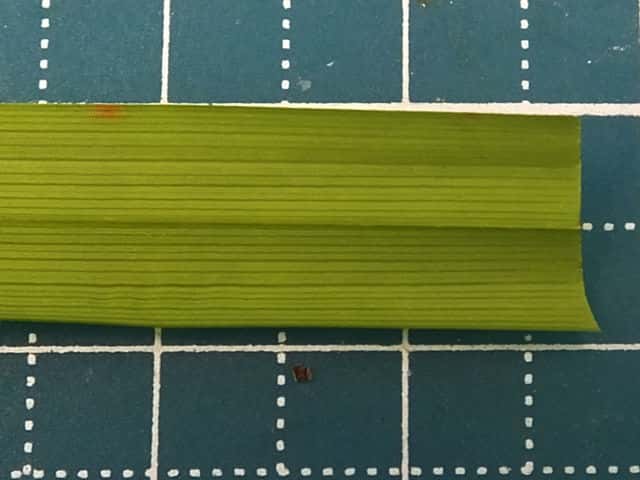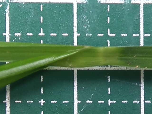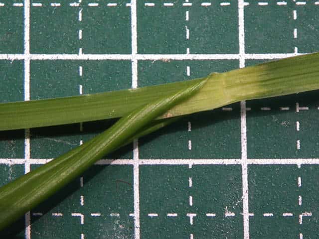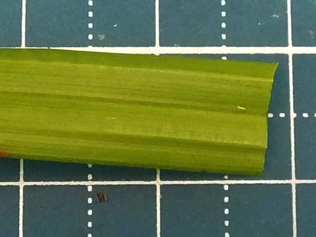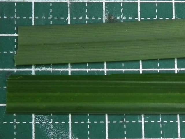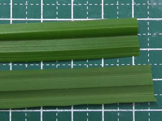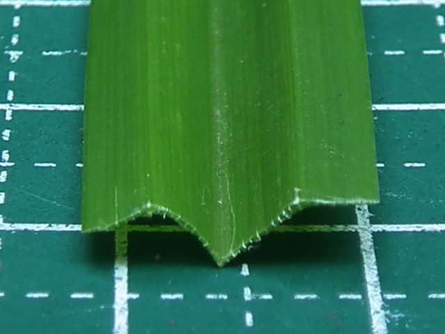 | ▼葉の表面(上)と裏面(下)。 | ▼葉の断面、幅は約12mm。 | ▼葉の裏面が白く見える。 |