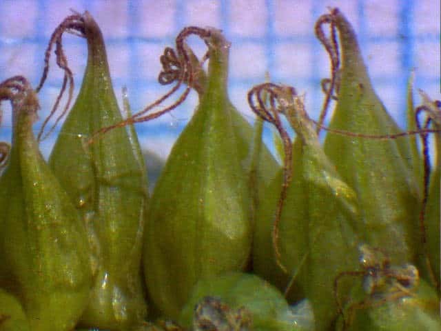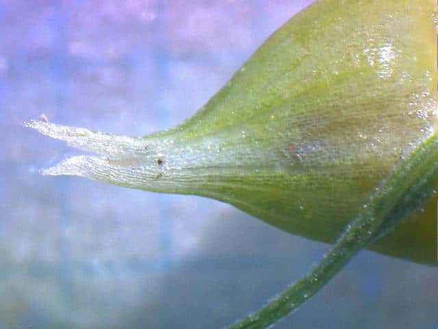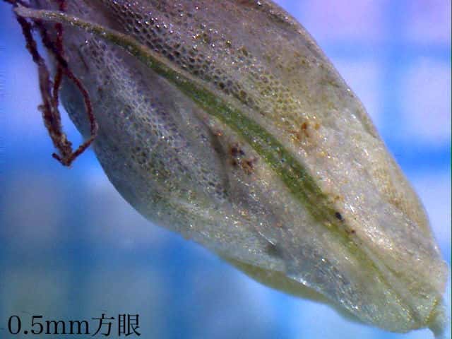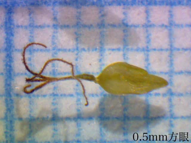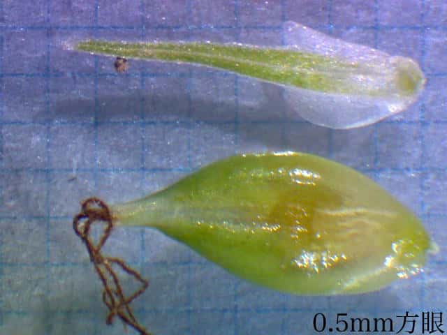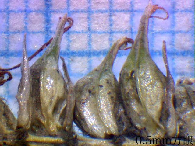| ▼柱頭が3岐する。(乾燥した標本) | ▼果実は3稜があり長さ約1.5mm。 | ▼果胞は長さ約3.5mm。 |