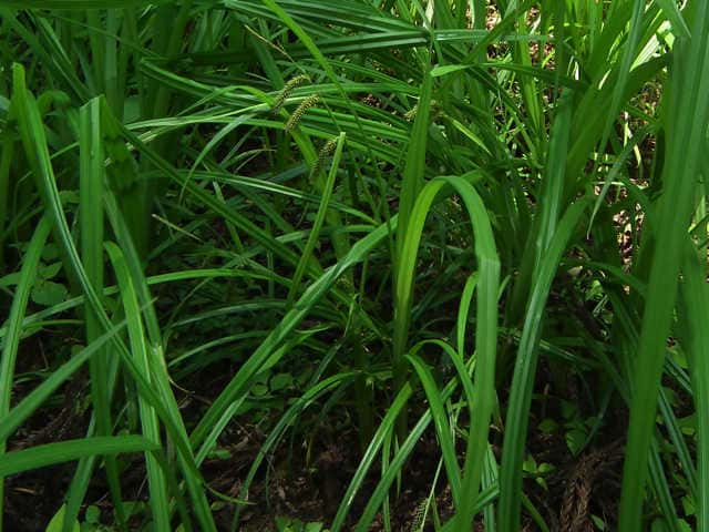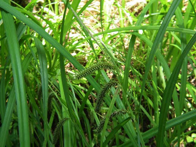 | 多年草 北海道〜九州のシイ・カシ帯からブナ帯下部の明るい湿った樹林内や林縁に生える。やや叢生し、匐枝を出す。基部の鞘は淡色。葉は幅5〜10mm。細乳頭状突起を密布して粉白色、特に下面が著しい。有花茎は高さ50〜70cm。小穂はほとんど柄がなく、苞の葉身は発達し、無鞘。頂小穂は雄性、長さ3〜6cm。側小穂3〜5個は雌性、長さ3〜6cm、斜上または先が垂れる。鱗片は緑白色、鋭頭で芒端、果胞とほぼ同長。果胞は長さ約4mm、無毛、嘴は長い。花柱は宿存し、柱頭は3岐。果期は5〜6月。 葉が幅広く強く粉白を帯び、雌小穂が垂れ下がる型と、葉がやや幅狭く粉白が弱く、雌小穂があまり垂れ下がらない型があるが、明確に区別ができない。(日本のスゲ) 学名は、Carex alopecuroides var. chlorostachya カヤツリグサ科スゲ属ヒメシラスゲ節 よく似たものにアイノコシラスゲがある。 [アイノコシラスゲ] 側小穂は2〜4個で雌性、互いに離れてつき、円柱状で長さ1〜4cm、幅5〜6mm。果胞は長さ3〜3.5mm、先は急に短い嘴になる。 (日本のスゲ 検索表) A 葉は少なくとも下面は細かい乳頭状突起があり粉白を帯びる B 雄小穂は柄がなく直下の雌小穂に接する C 茎や葉はあまりざらつかない D 果胞は先がしだいに狭くなって長嘴 ・・・・シラスゲ D 果胞は先が急に短い嘴になる ・・・・・・・アイノコシラスゲ |