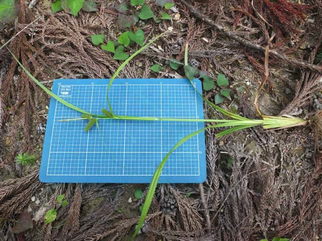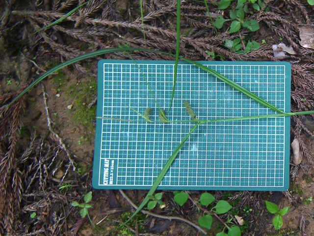 | ▼果実は長さ約1.6mm。 | ▼小穂まで高さ約47cm。 | ▼苞は長い葉状。 |