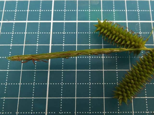 | ▼雄小穂は細く、長さ約4.5cm。 | ▼雄鱗片は線形で長さ約5mm。 | ▼雌小穂は長さ約2.5、ほとんど無柄。 |