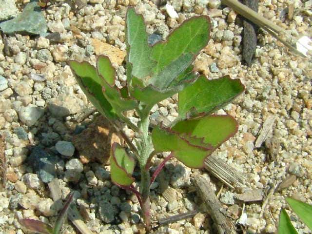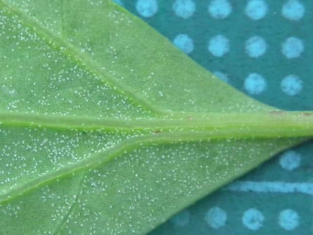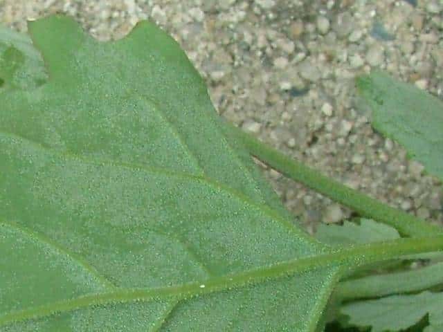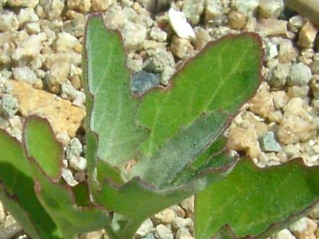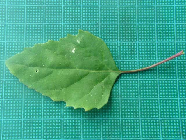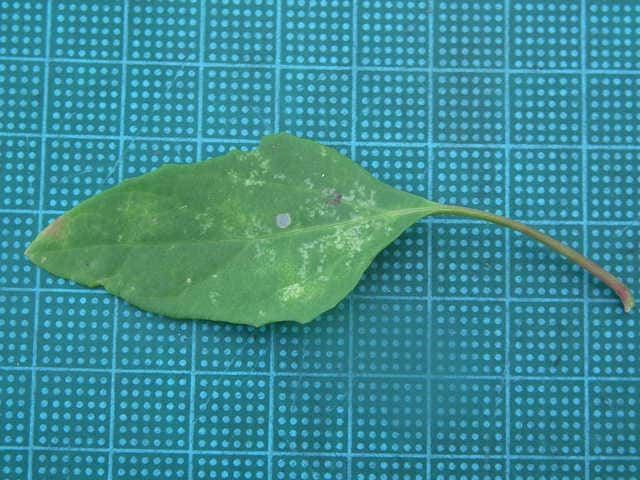 | ▼中部の葉の葉身は長さ約5cm。 | ▼裏面には白い粉状の毛がある。 | |