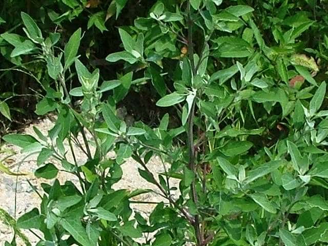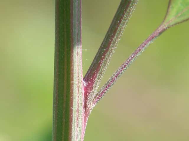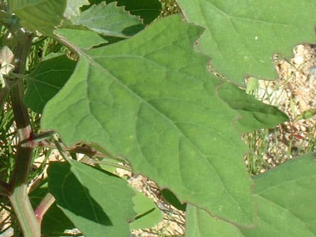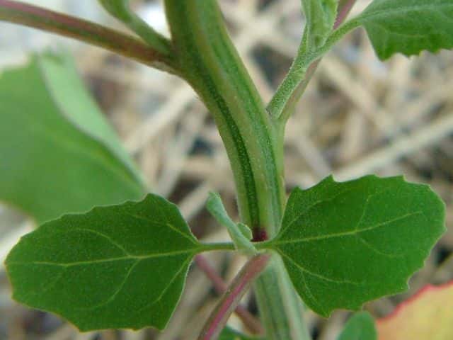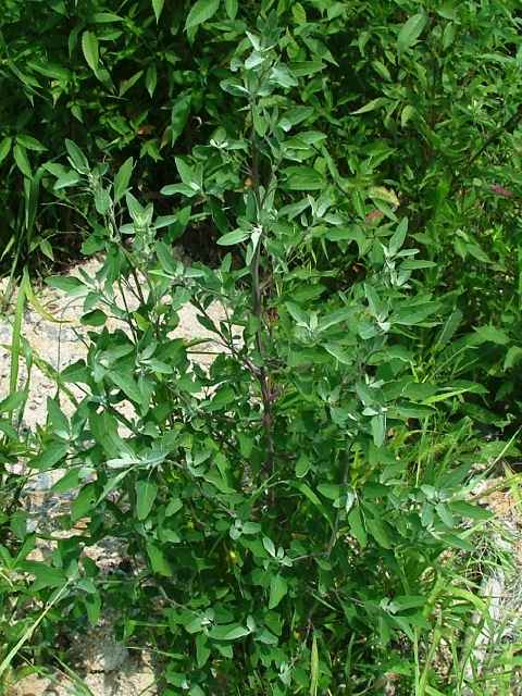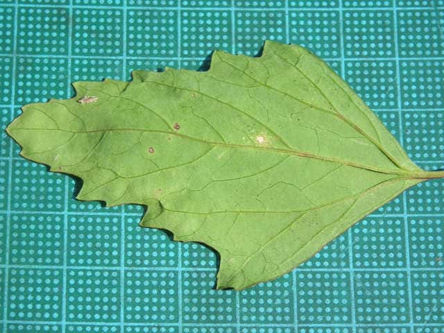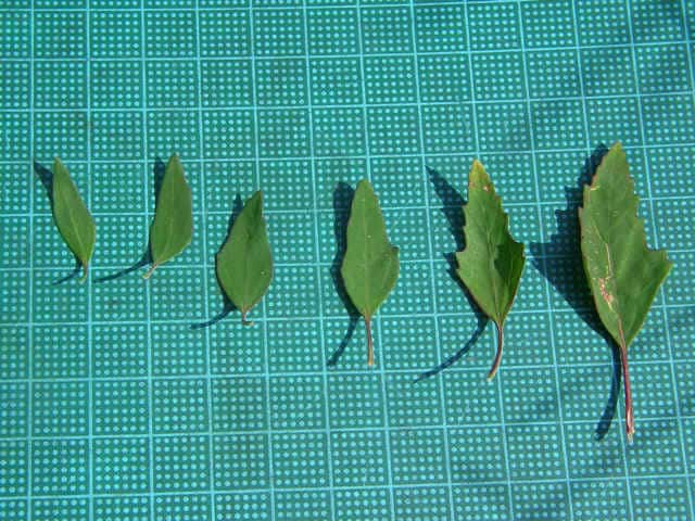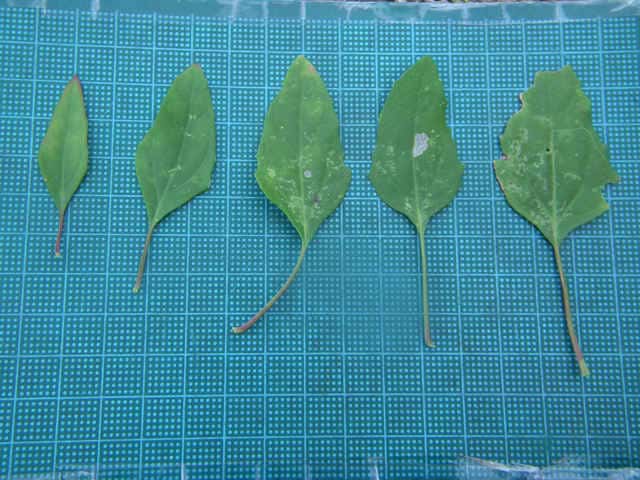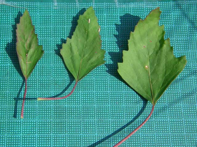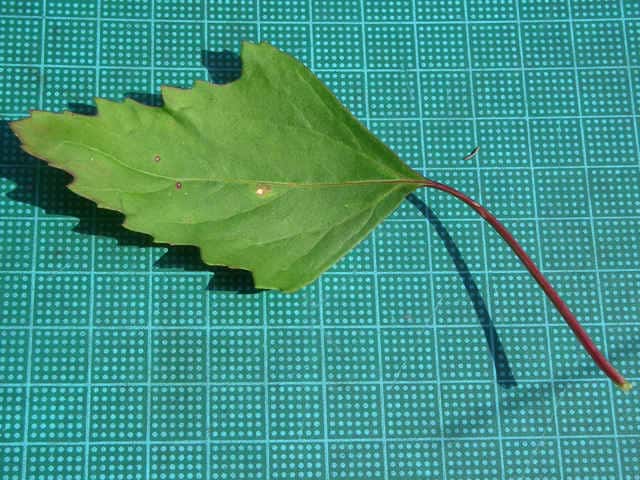 | ▼上部から下部までの葉 上部は披針形で全縁だが、下部では菱形で鋸歯がある。 | ||