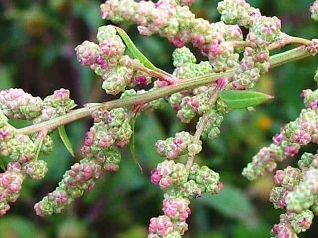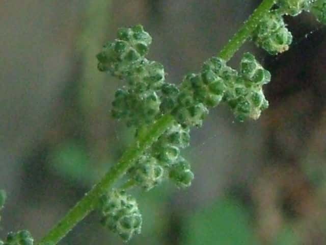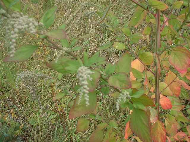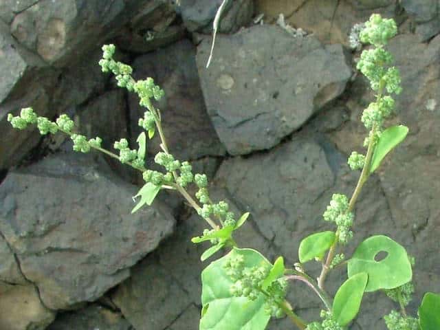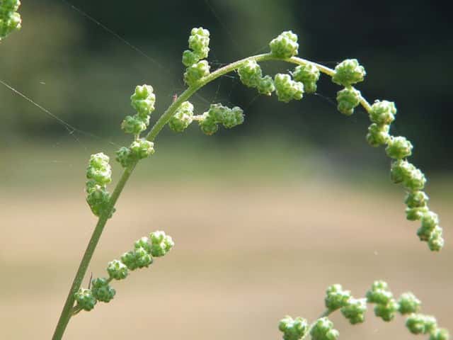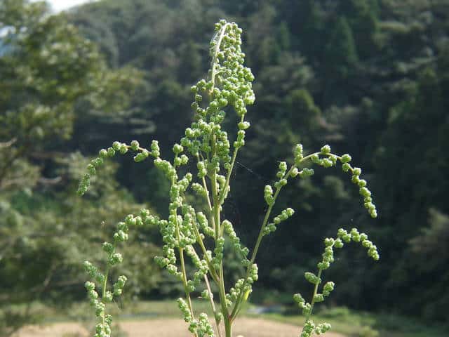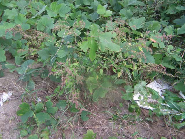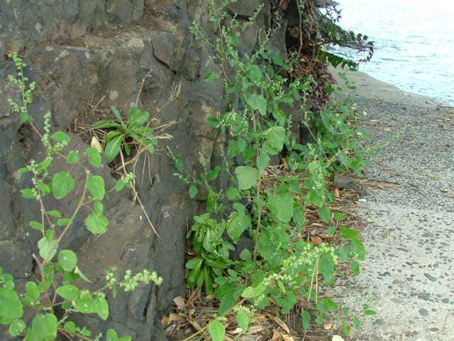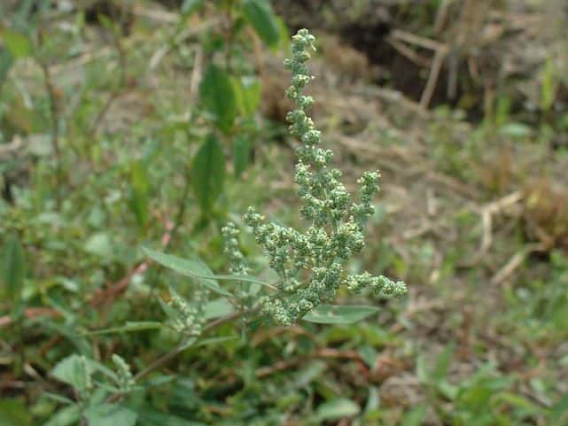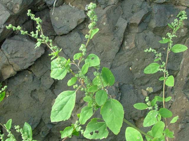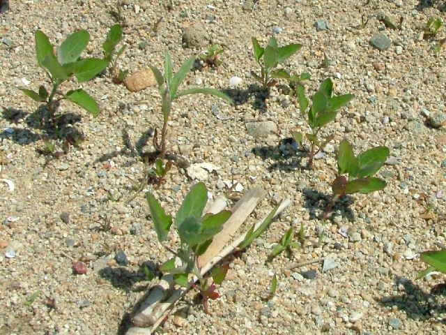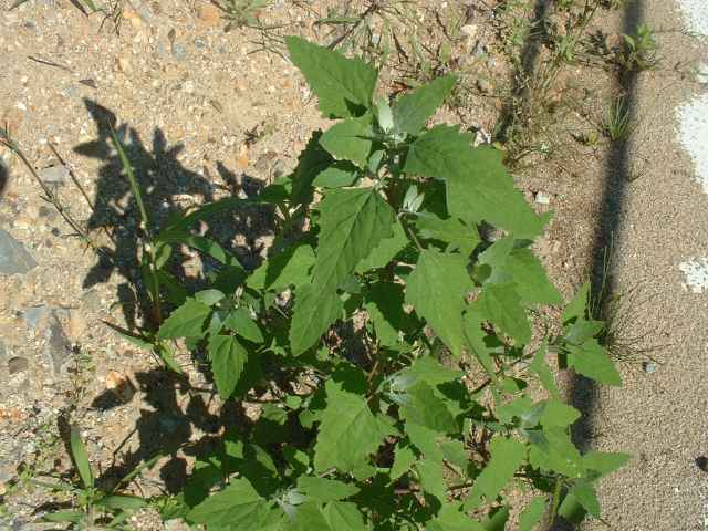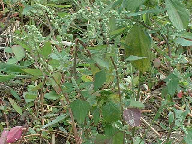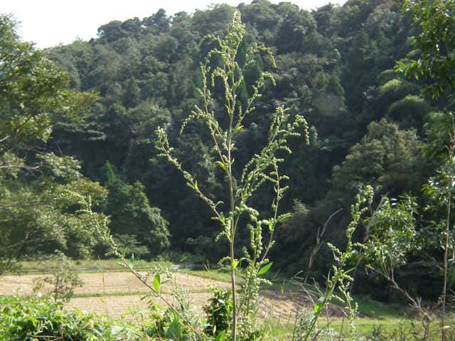 | 1年草 日本全土の荒地や畑のへりに多い。茎は一般に直立して、多くの枝を分け、高さ60〜120cmになるが、畑地に生えるものでは基部から分枝して斜上し、高さ20cmほどにしかならない型もある。葉は柄があり、下部の葉は菱状卵形〜卵形、上部の葉は長卵形〜披針形、先は鋭形か鈍形、基部は広いくさび形、やや厚く、縁に大小の歯牙があり、長さ1.5〜7(〜12)cm、幅1〜5(〜8)cm、若い葉には白色または淡紅色の粉状毛がある。花は頂生および腋生で、円錐状に集まり、一般に密に花をつけるが、まばらにつくこともある。花被片は広卵形〜楕円形、長さ約1mmで、中肋は高まって稜となる。胞果は水平な卵形、果皮は薄い。種子は凸レンズ形、径1〜1.5mm、黒色で光沢があり、一部が嘴状に突出する。花期は9〜10月。(日本の野生植物) 学名は、Chenopodium album ヒユ科アカザ属 よく似たものにアカザがあるが、現在ではほとんど見られなくなっている。 |