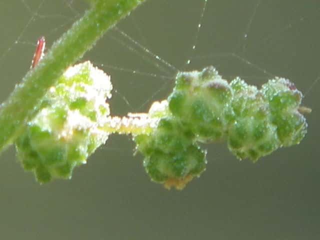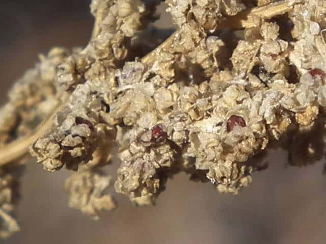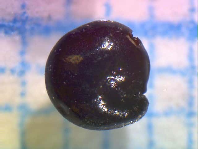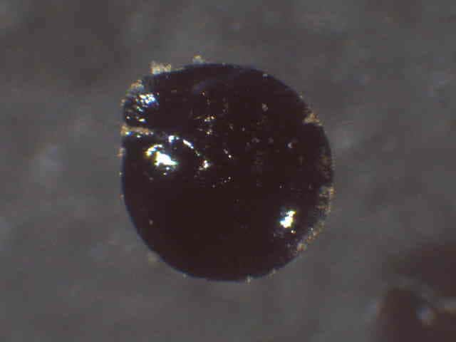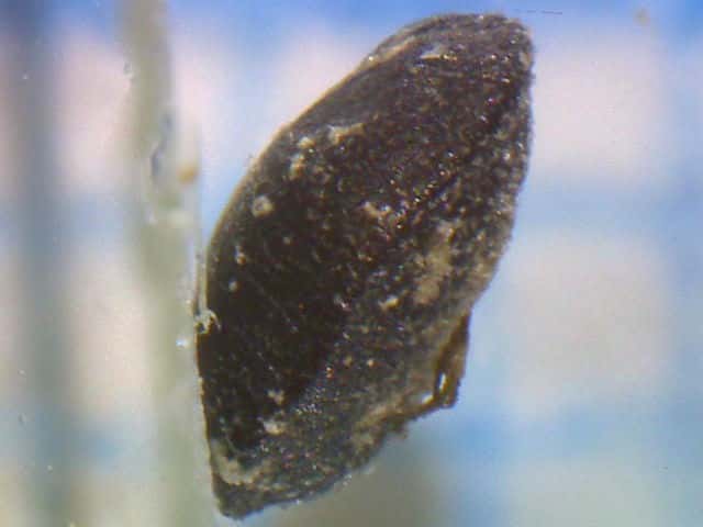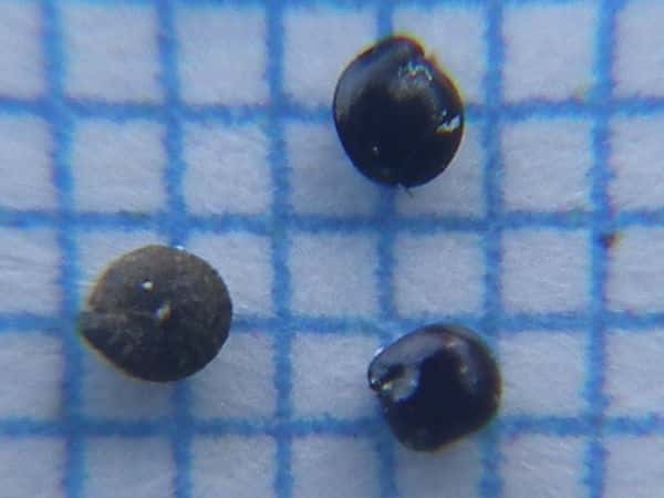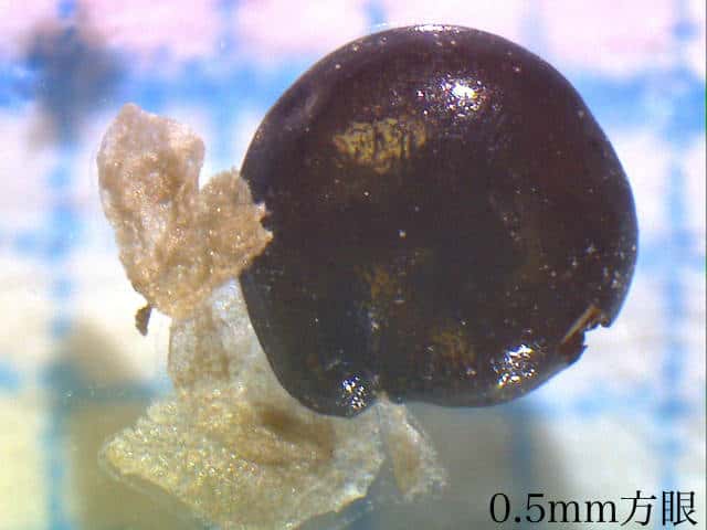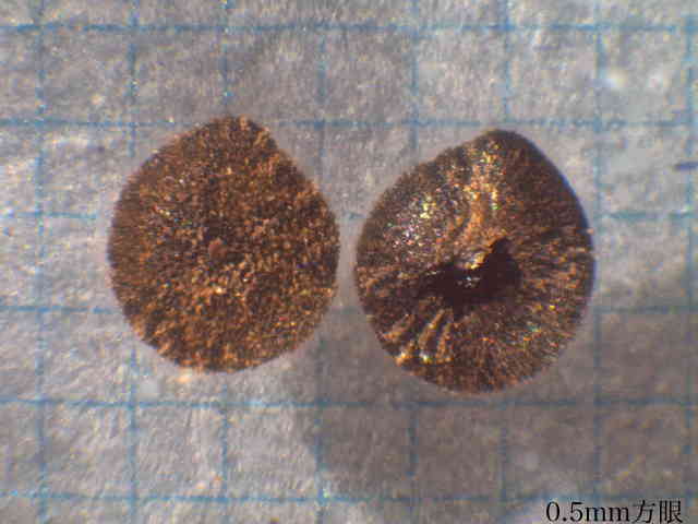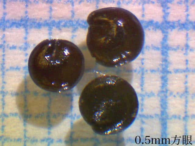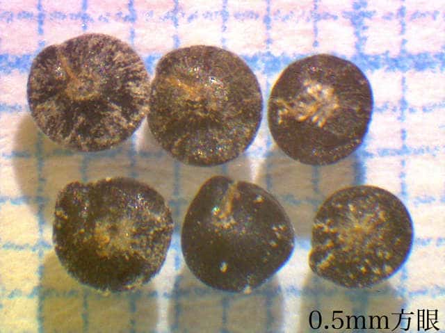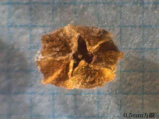 | ▼果実は直径約1〜1.3mm。 | ▼果実は直径約1.3mm、薄い果皮が包む。 | ▼果実の側面、厚みがなく扁平。 |