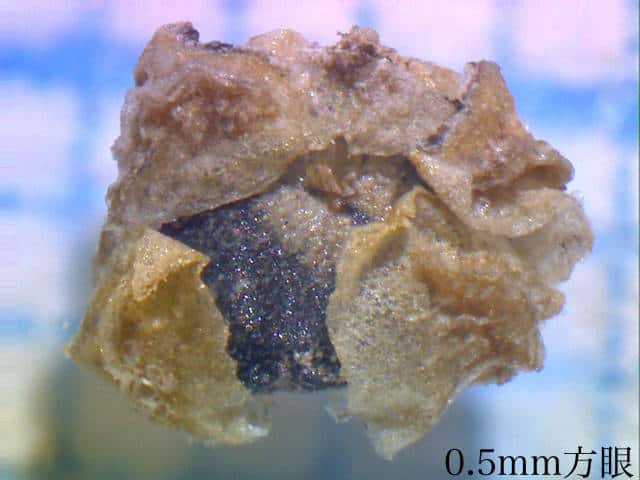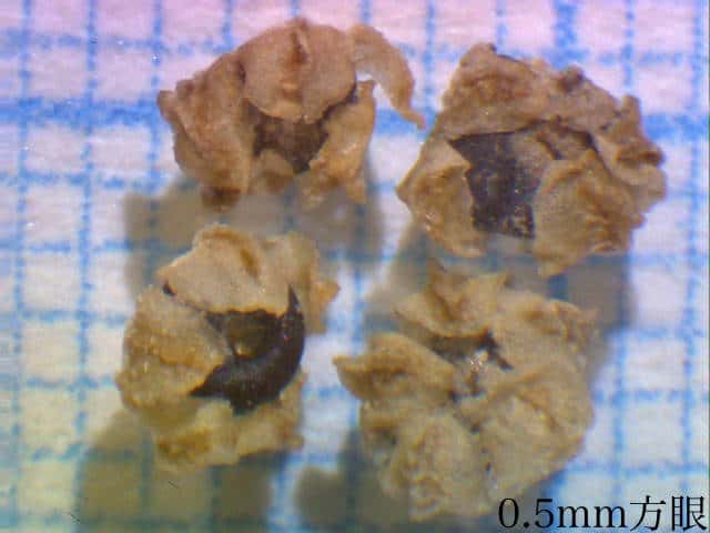 | ▼果実を包んだ花被は直径約1.5mm。 | ▼薄い果皮に覆われた果実は直径約1.4mm。 | ▼薄い果皮の下に黒い種子がある。 |