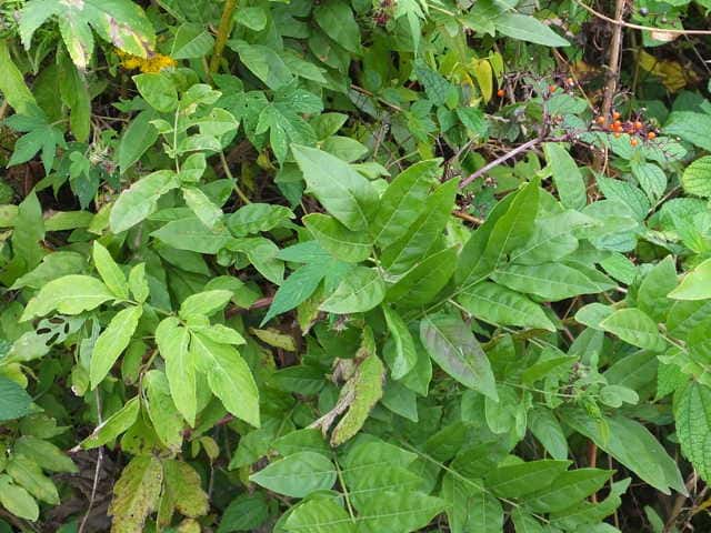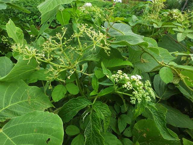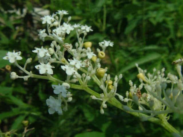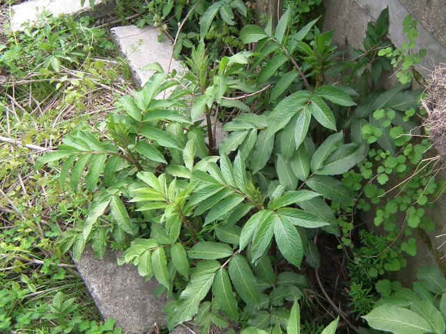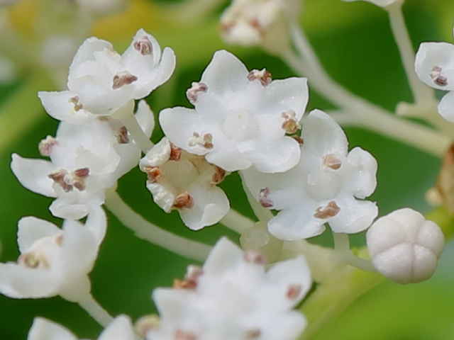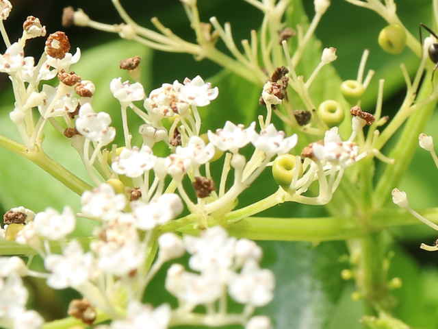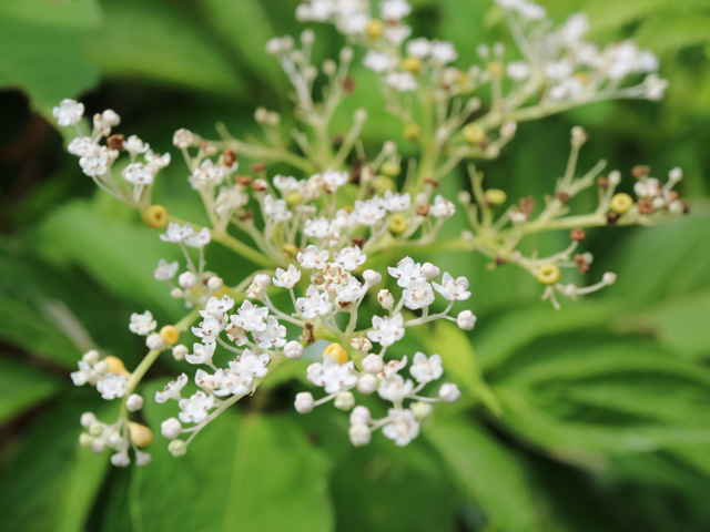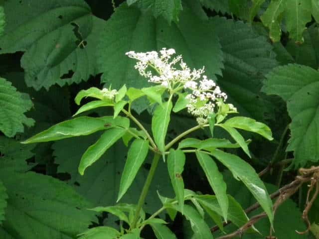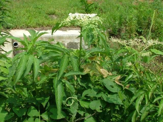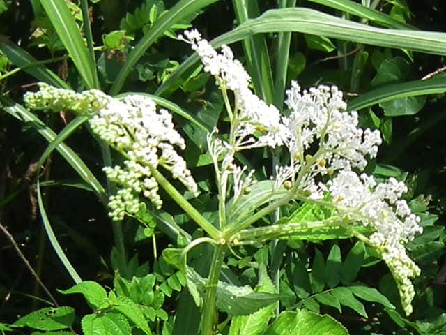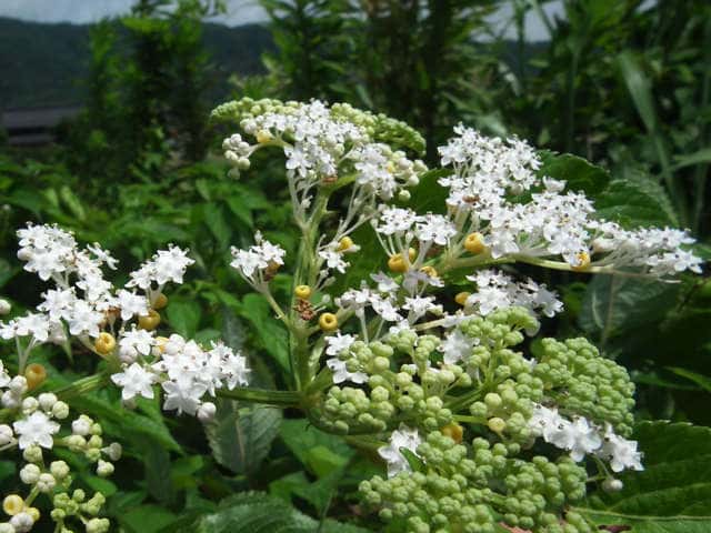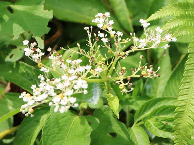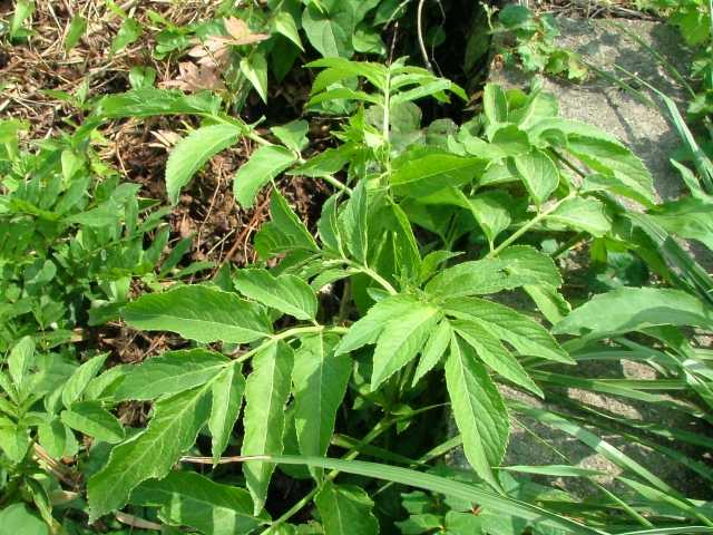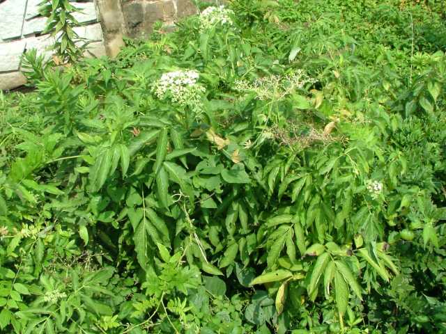 | 多年草 本州〜九州の山野や人家のそばなどに生える。高さ1〜1.5m。葉は大型の奇数羽状複葉で対生する。小葉は5〜7個で長さ5〜17cmの広披針形または狭卵形。茎の先に白い小さな花をびっしりとつける。花冠は深く5裂して、皿のように開出する。花には蜜はなく、花序のところどころにある黄色の腺体に蜜をためる。花序の上部は平ら。果実は直径約4mmの球形で赤く熟す。花期は7〜8月。(野に咲く花) 学名は、Sambucus chinensis ガマズミ科ニワトコ属 |