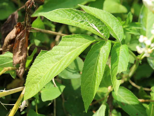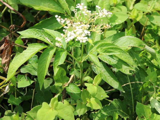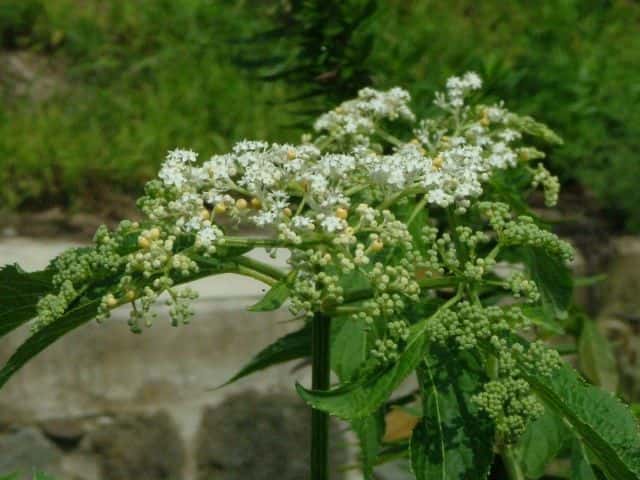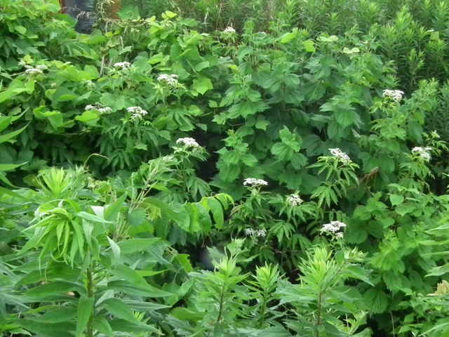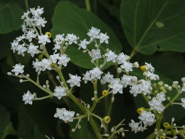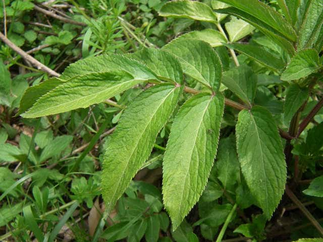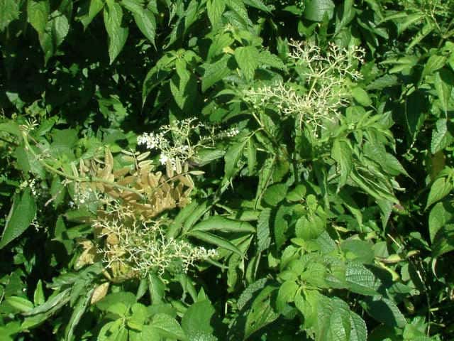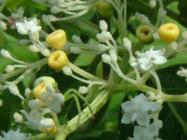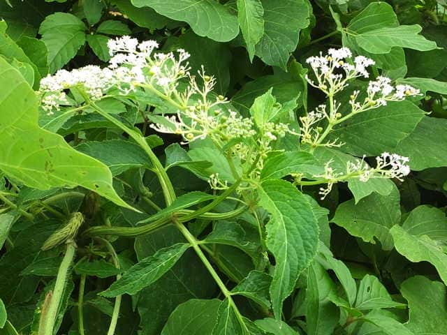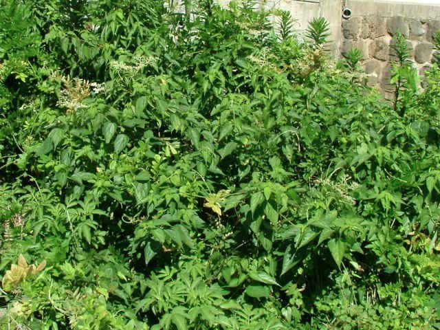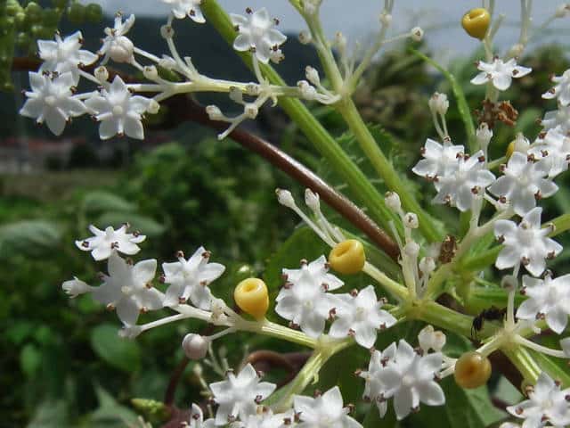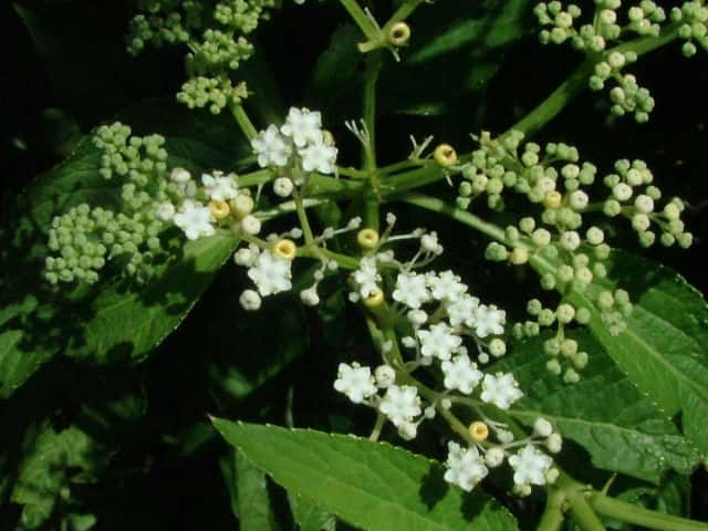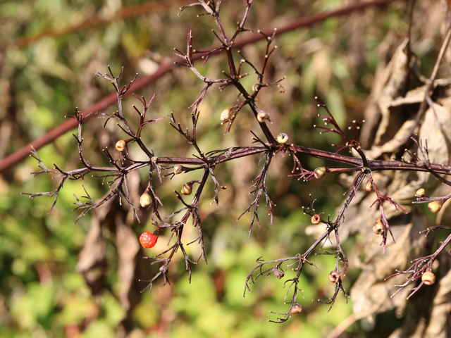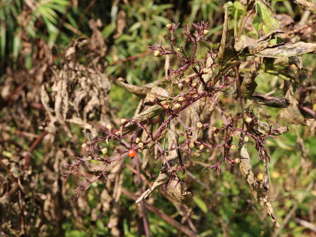 | 多年草 本州〜九州の山野や人家のそばなどに生える。高さ1〜1.5m。葉は大型の奇数羽状複葉で対生する。小葉は5〜7個で長さ5〜17cmの広披針形または狭卵形。茎の先に白い小さな花をびっしりとつける。花冠は深く5裂して、皿のように開出する。花には蜜はなく、花序のところどころにある黄色の腺体に蜜をためる。花序の上部は平ら。果実は直径約4mmの球形で赤く熟す。花期は7〜8月。(野に咲く花) 学名は、Sambucus chinensis ガマズミ科ニワトコ属 |