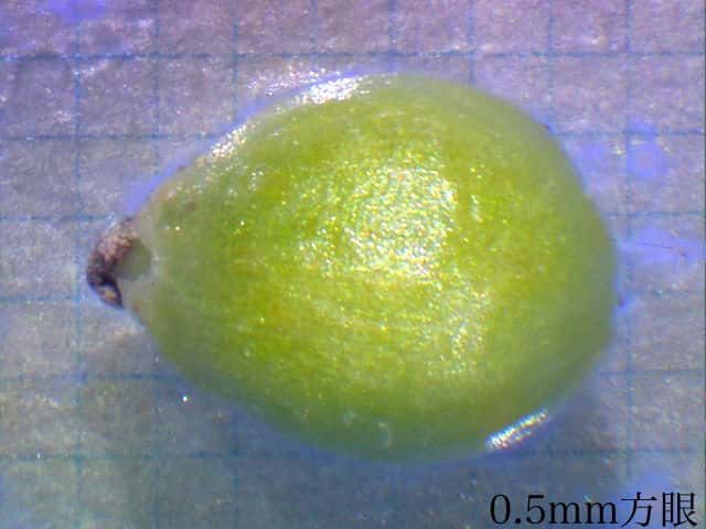 | ▼若い果実は長さ約3mm。 | ▼果実の先端に小さな萼が残る。 | |