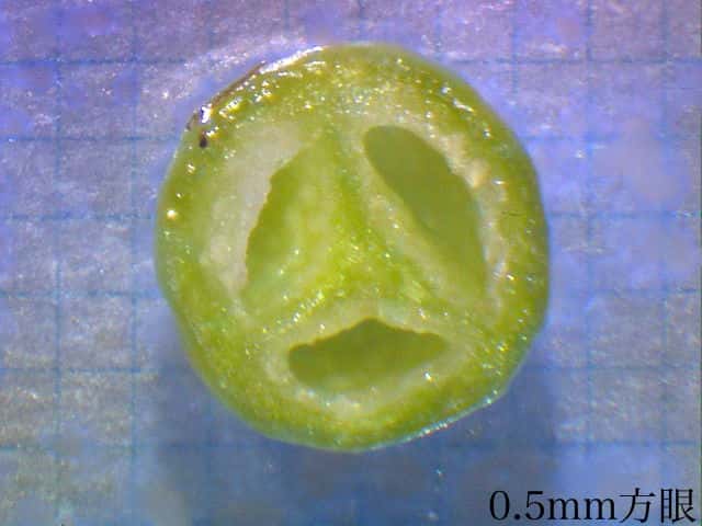 | ▼果実の横断面、核が3個ある。 | ▼未熟な核は長さ約2mm。 | |